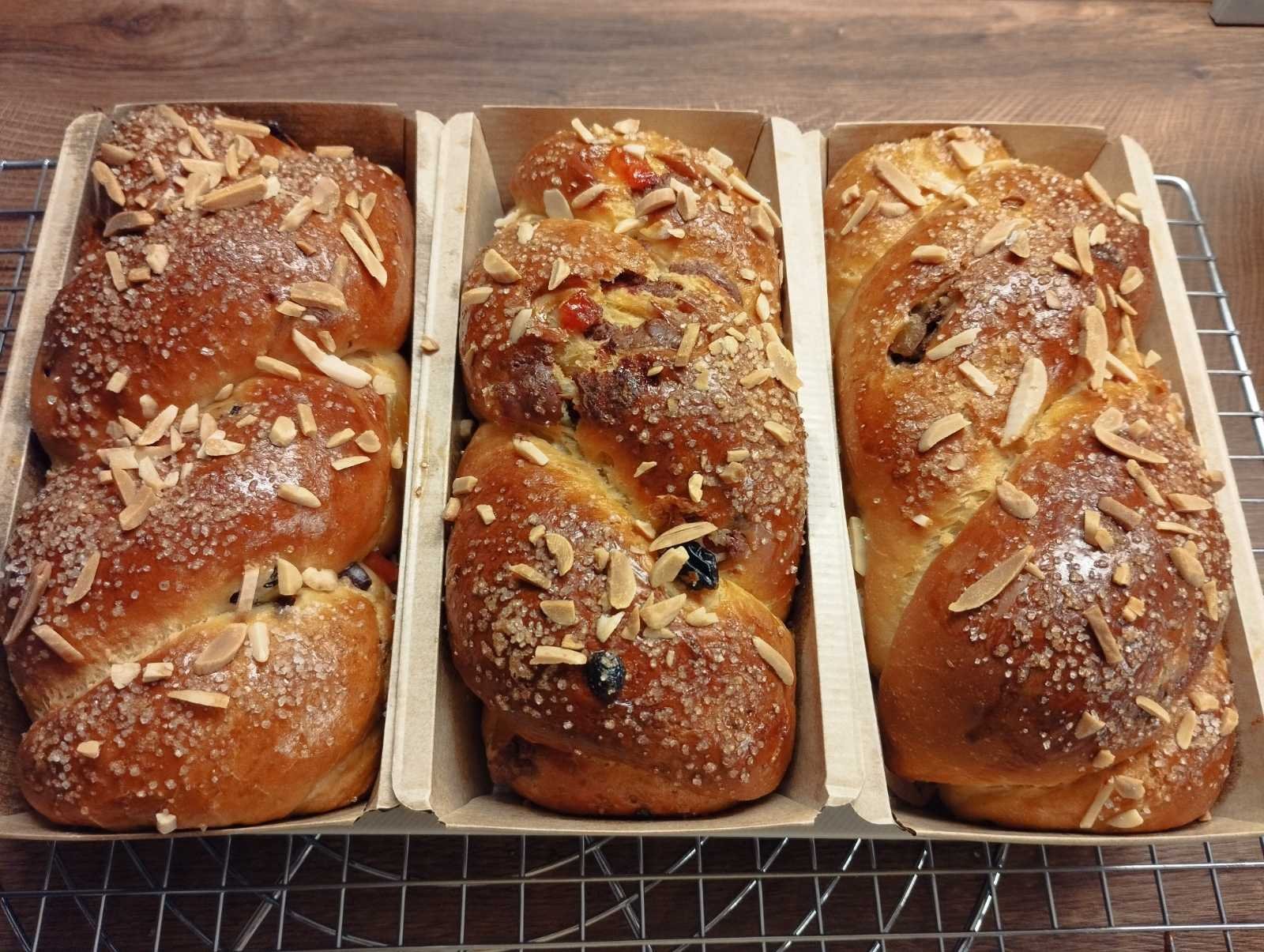 Първите козунаци са изпечени и опаковани за раздаване. По рецептата с кондензирано мляко, само замениха маята с активен течен квас (60г), с втасване в хладилника. Много мекички стават. В тестото премесих стафиди а плънката е смес от кафе, Тиа Мария, смлени орехи и натрошен шоколад. Уникално ароматна стана, мисля и следващите да са с нея. Малко ги изтървах с печенето, готвих обяда по същото време и се отплеснах. Joy