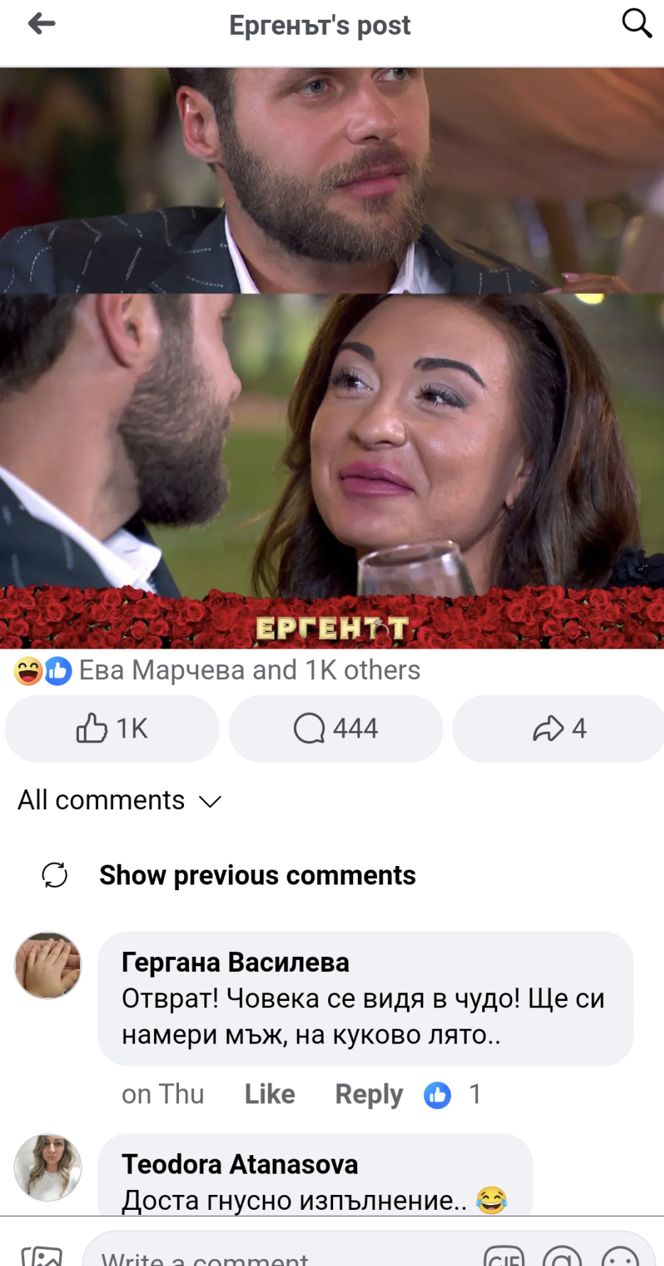 Чак сега успях да гледам снощната тройна среща на раздора. Виктория беше отвратителна и си заслужи унижението отвсякъде! Мария дори на синхрони не каза лоша дума за нея, а оная от самото начало не спря да храчи високомерно за уж приятелката си. Отвратително същество, злобно и завистливо, въобще не ми е жал! А, също така въобще не съм скандализирана от сексуалността на Мария, Гергана от първи сезон беше по-гнусна. Това на Мария си беше флирт и то доста успешен.