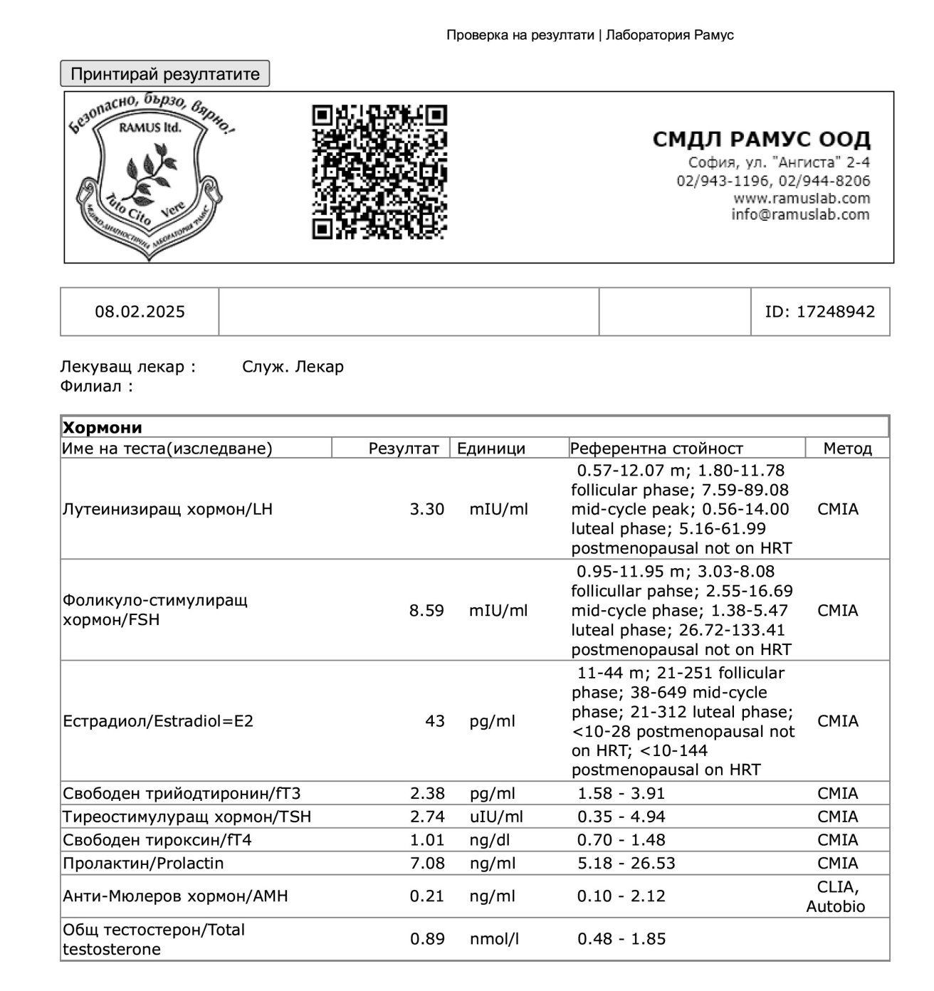 След вашите препоръки избрах да се консултирам със Сенкова за инвитро. Това са ми резултатите на 2ри ден от цикъла. Пунах ги в Рамус, но са им малко странни референтните стойности (поне за мен, досега не съм пускала там), особенно на АМХ - горна граница 2, това ли е оптималната стойност.