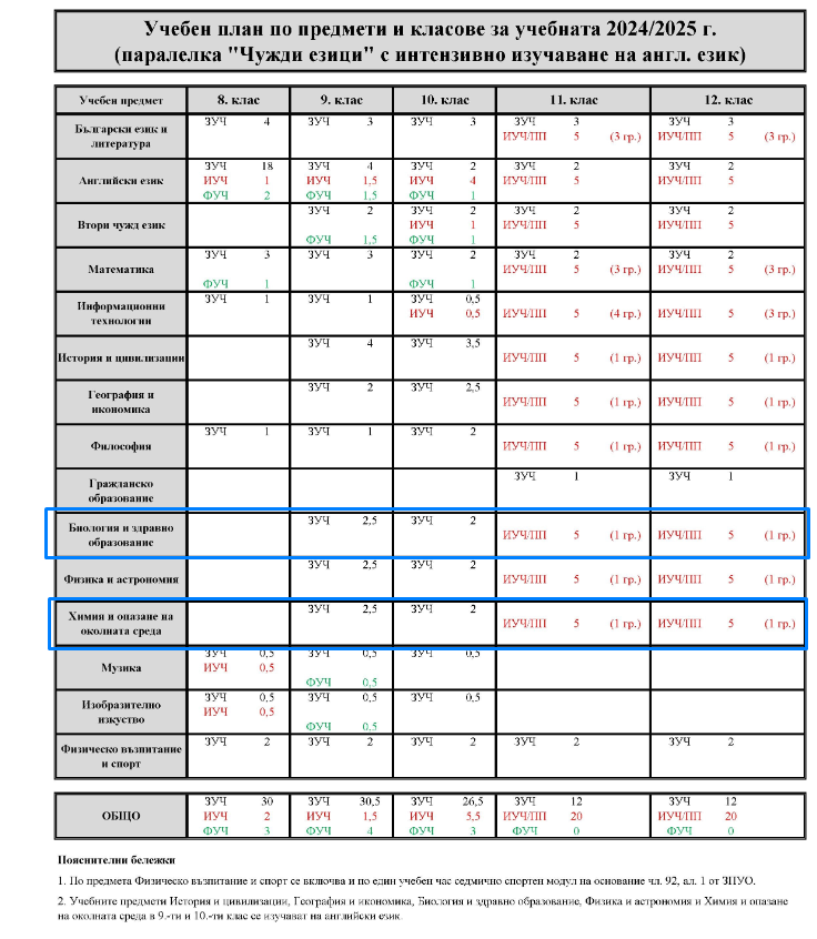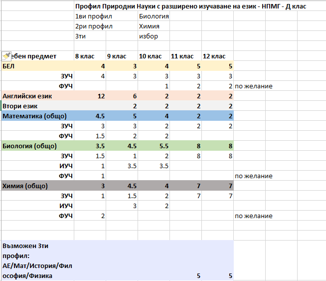 Ето часовете по учебен план в НПМГ профил Биол/Химия