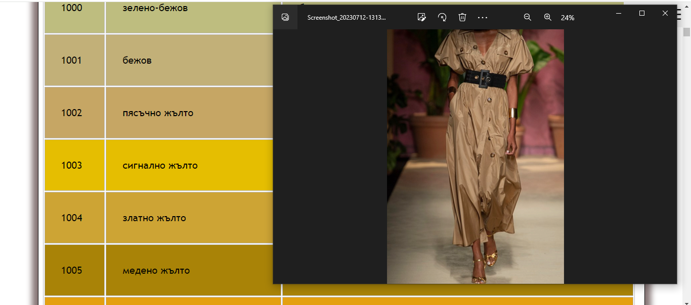 Цвета е като старо злато, и това ме притеснява, че .. не знам дали ще ми отива, дали няма да ме състарява. Оригиналната рокля е с светло кафява според мен, РАЛ го определя като 1002 -  пясъчно жълто.
