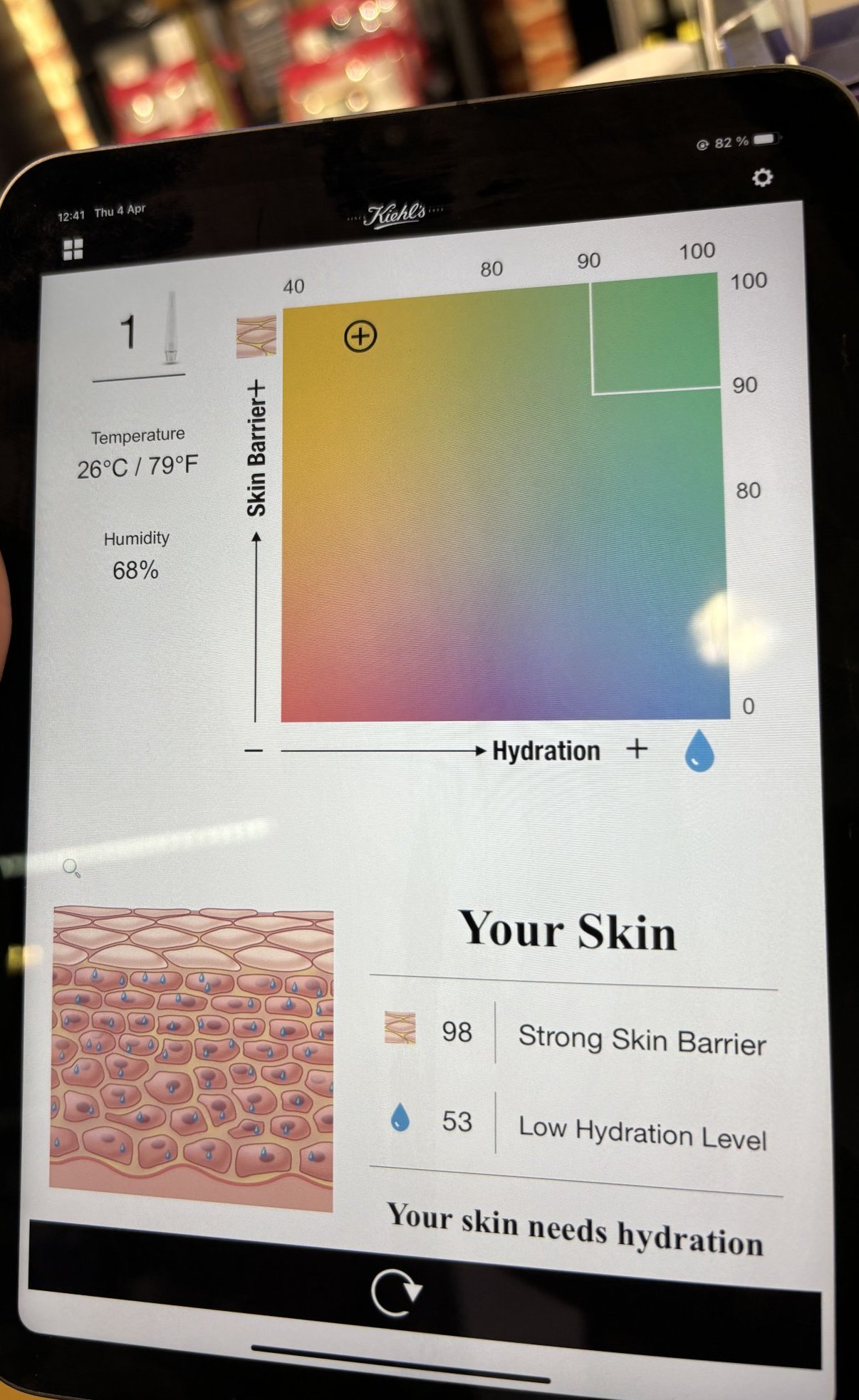 Правиха ми скин тест с някаква джаджа на Kiehl’s днес. Ще трябва да се хидратирам повече. Пробвайте, ако имате възможност, отнема около минута.