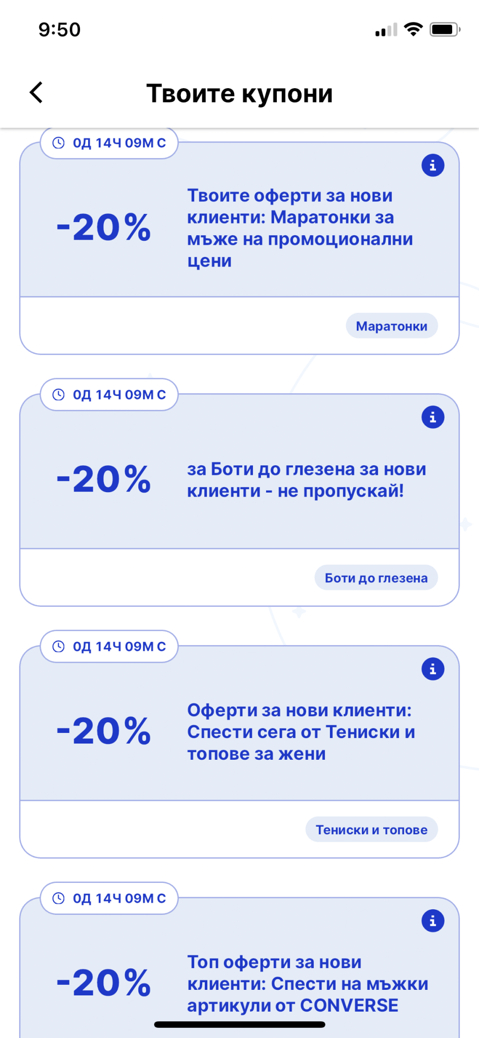 Аз имам 5 кода по 20% за разни категории,но като изляза извън профила си. Като вляза изчезват,няма ги. Отдавна е така. Не следя кодовете защото имаше хубави инфлуенсърски кодове. Сега се сетих за тях и направих пак опит да видя - същата работа. Извън профила кодовете се появяват,като вляза изчезват.