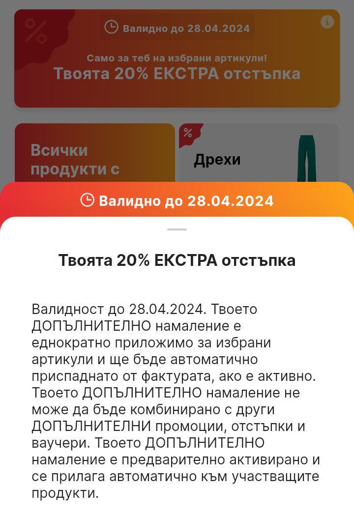 Моя другата седмица и от няколко дни в приложението имам 20% до началото на Май еднократно