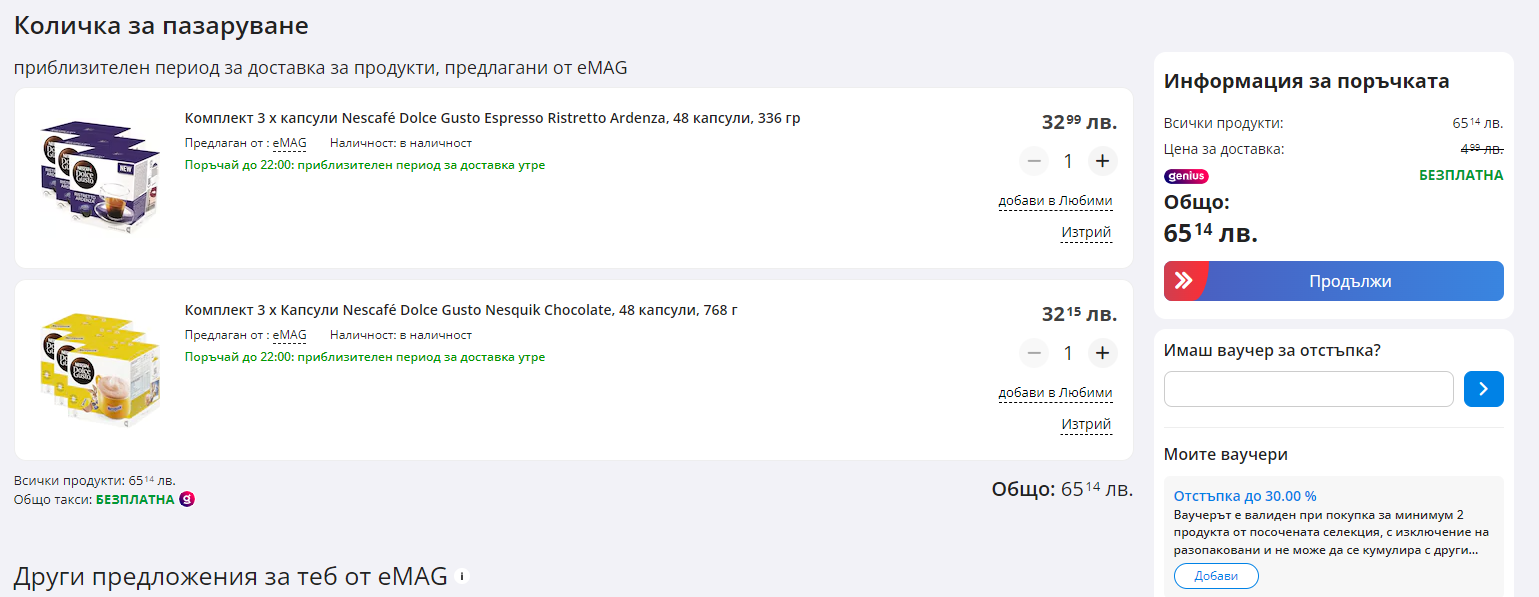 При мен си излиза като отида на количката. Дава си безплатна доставка до Easybox и с куриер.