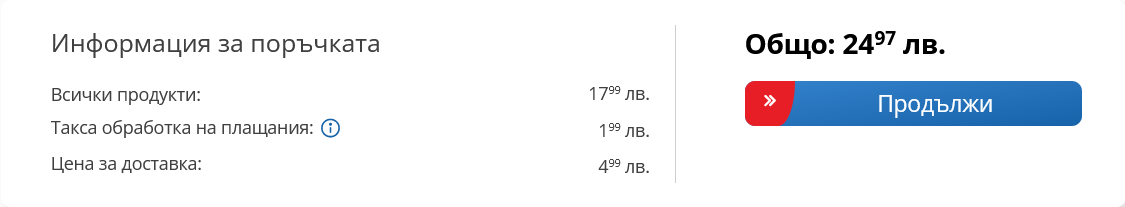 То не беше промоция, на редовна цена си бяха продуктите. На края се калкулира цената и към нея отдолу разбивката беше цената на самите продукти, което е ок, доставка 10 лв, което е ок, 2 лв за обработка на наложен платеж и буквално цитирам "такси 20 лв", с предложение да ги сваля чрез някакъв си код с 9 лв. Отказах се естествено, но ми беше супер странно. А, не ми се минава през ботовете да ме мотаят, за да търся обяснение.