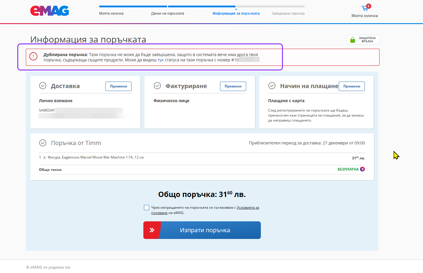 При положение, че първата фигурка е платена, как е възможно на никого да не му е хрумнало, че може да има случай, в който да има 2 поредни поръчки с един и същ продукт. Как е възможно да не са се сетили да покажат въпрос от сорта: Вече същестува друга активна поръчка със същия продукт. Сигурни ли сте, че искате направите нова поръчка?