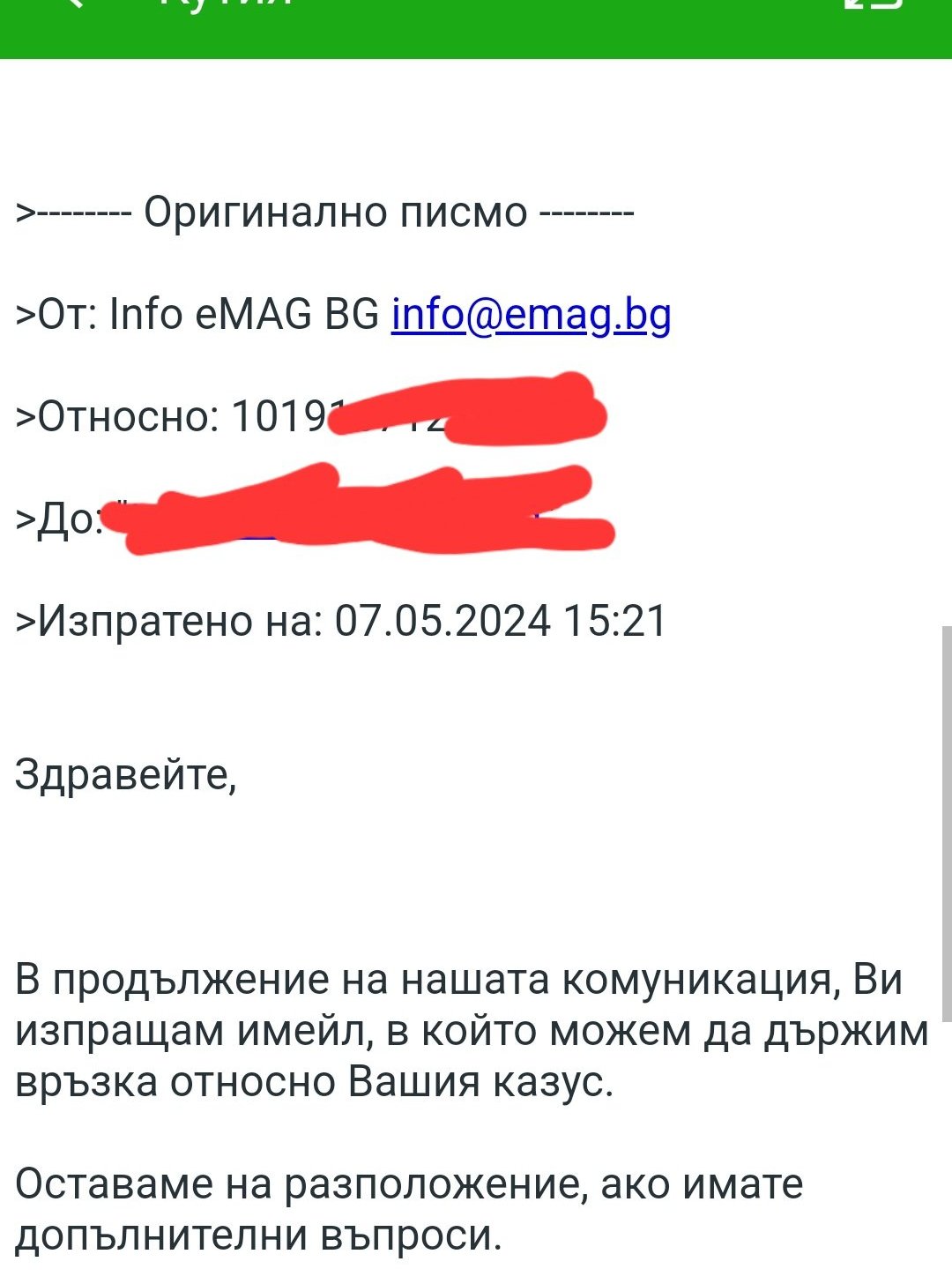 Понякога съм доволна, понакога не съм доволна. Последно бях недоволна със забовена доставка на чорапи от вътшен търговец във Франция. След като ги подпалих в чата и на имейл нюколко дена подред, ми се обаждаха 3-4 пъти и то различни служители, като на всеки обяснявах наново какъв е казуса. Което значи че няколко преписки отделни са образували, не една. Свързаха се с продавача и скоро си палучих чорапите. Също ваучер за 10 лв, който ползвах скоро след това.