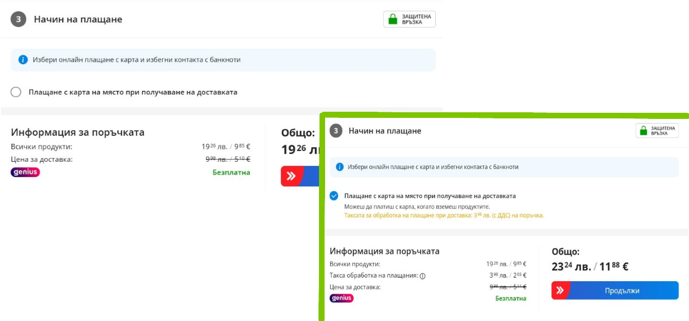 Това май зависи от търговеца. Аз скоро поръчвах чаша за подарък и също не ми даваше опцията за плащане с карта. Обаче таксата беше лев и нещо при мен.