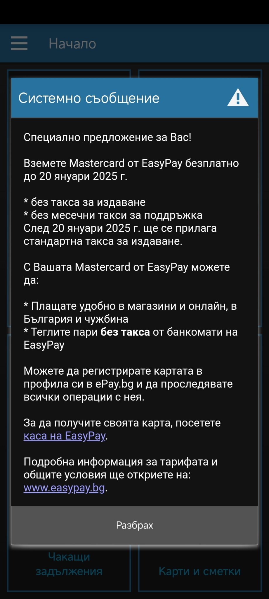 Влизам в приложението ePay и ми излезе съобщение, че специално за мен до 20.01.2025г. мога да взема MasterCard безплатно, иначе е 5лв. Без месечна такса обслужване. Нямам имейл, което е странно, защото можеше да пропусна офертата. Няма съобщение в сайта или фейсбук страницата им, тоест може би наистина не е за всички, но ако някой има мерак, нека каже в EasyPay, че е получил същото съобщение, пък кой знае, може и да му я дадат безплатно.