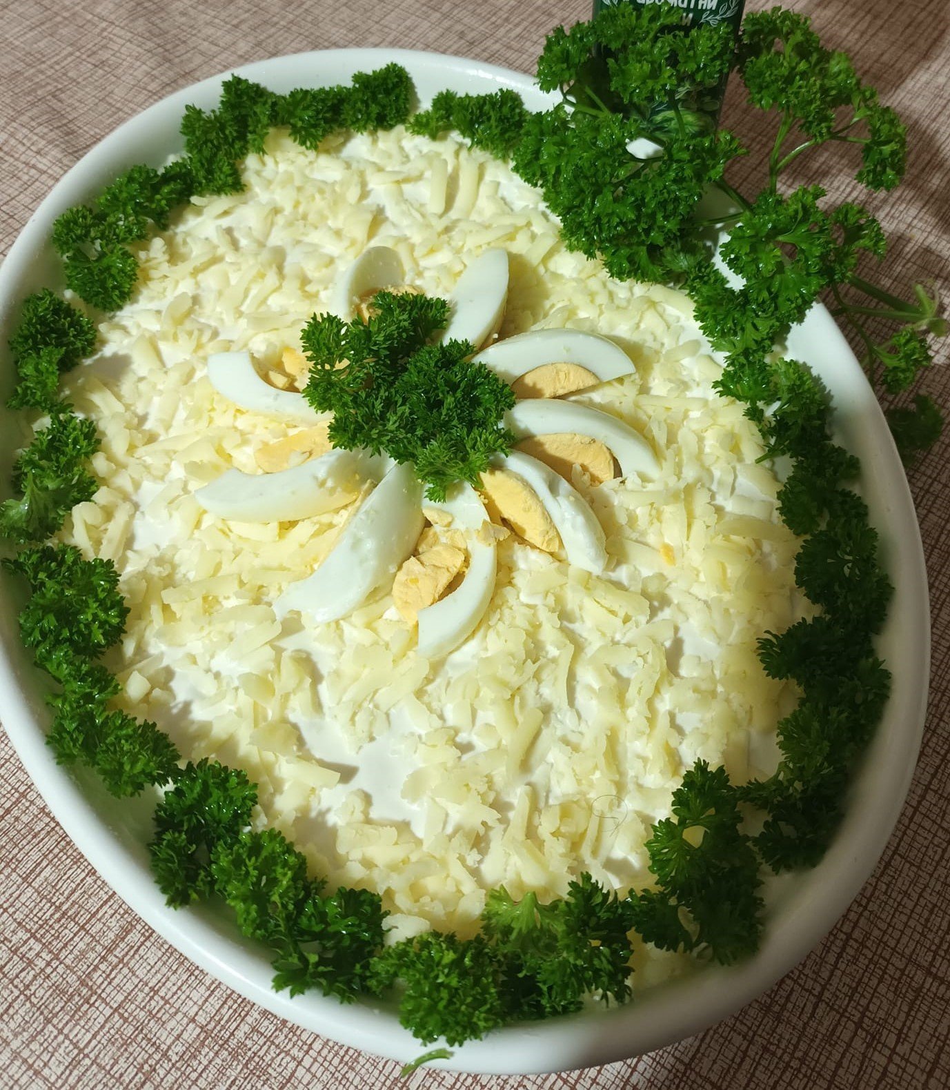 Руска салата- консерва грах, нарязани на кубчета кисели краставички, нарязани на кубчета сварени картофи, моркови и яйца, шунка, настъргана ябълка и майонеза.