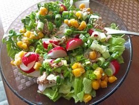 Салата с  марулки, краставици, репички и царевица Bonduelle от консерва, овкусена с лимон,сол и зехтин.