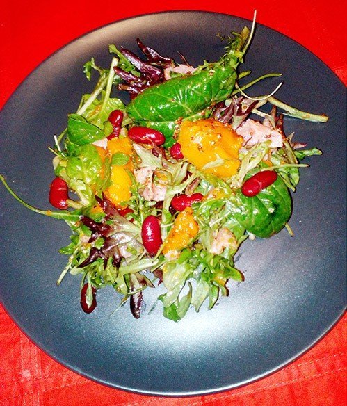 Сложете  в голяма купа измитата и подсушена салата. Добавете изцедения от течността боб.