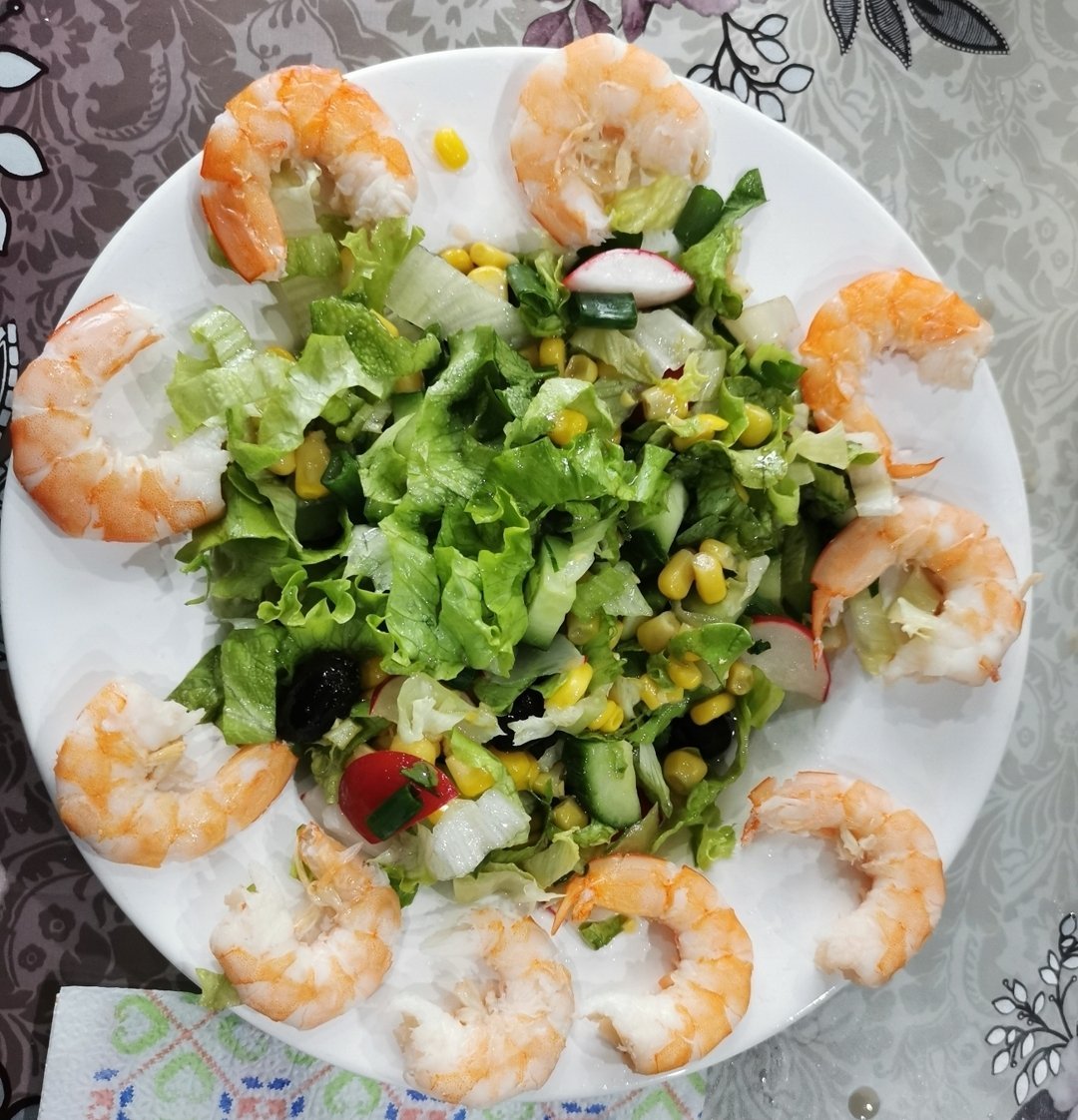 Зелена салата с царевица и скариди, а също и задушени зеленчуци.