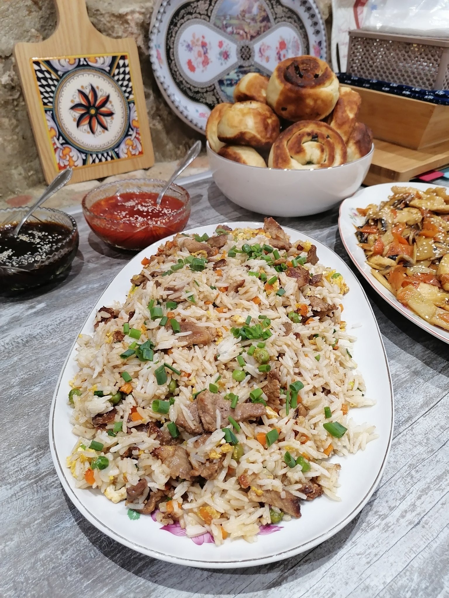 Загряваме уок на по-силна температура с 3-4 с.л. сусамово или слънчогледово олио. Добавяме първо нарязания лук и морковите. Запържваме за около минута, две. Добавяме после граха и зеления лук и пържим още минута. Добавяме яйцата, бъркаме енергично, докато се раздробят. Следва месото, отново разбъркваме и добавяме ориза. С ориза добавяме и всички подправки - сол, пипер, соев сос, оризов оцет и накрая маслото. Разбъркваме хубаво, опитваме и при нужда си добавяме още малко соев сос или сол. Сваляме от котлона, сипваме в сервизна чиния, поръсваме с отделения нарязан зелен лук и сервираме топло.