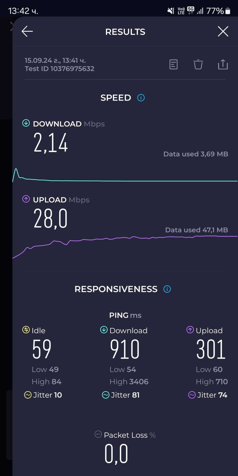 Иначе бях забравила че не се достигат максималните скорости. Това са ми данните от тест на мобилния интернет от телефона. Не знам кое е по важно - даунлоада или ъплоуда за това което търся (работа + ТВ).