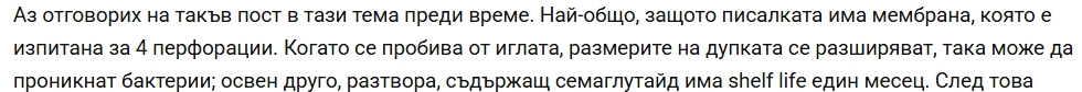 Месеци наред си придавахте важност в темата с общи приказки и буквоядство. Първо настоятелно убеждавахте хората да не си разделят високите дози и да плащат в пъти повече за същото. Плашехте ги, че е опасно, че медикаментът няма необходимия срок на годност след първата употреба или че мембраната не трябва да се перфорира повече от 4 пъти. Оказа се, че всичко това са измислици - може да се дупчи многократно, а срокът на медикамента, дори според данните от Novo, е напълно достатъчен за двумесечната употреба, както се прави с пациенти по цял свят, включително и с пациенти с протоколи по НЗОК, при които това е и единствената изписвана доза.
