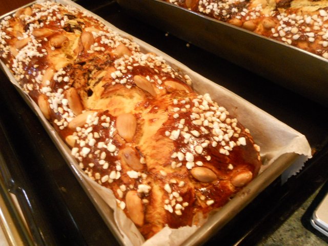 "Великденска козуначена на" (месене и втасване в хлебопекарната). Голямата щерка искаше да сложа домашен мармалад от сливи и ябълки. Отгоре поръси с филирани бадеми и захар.