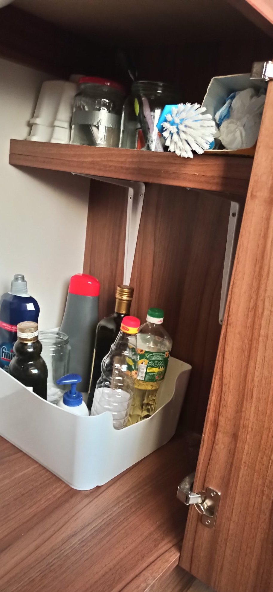Аз си направих рафтчета в шкафа под мивката с подръчни налични материали, бързо и евтино, и удобно
