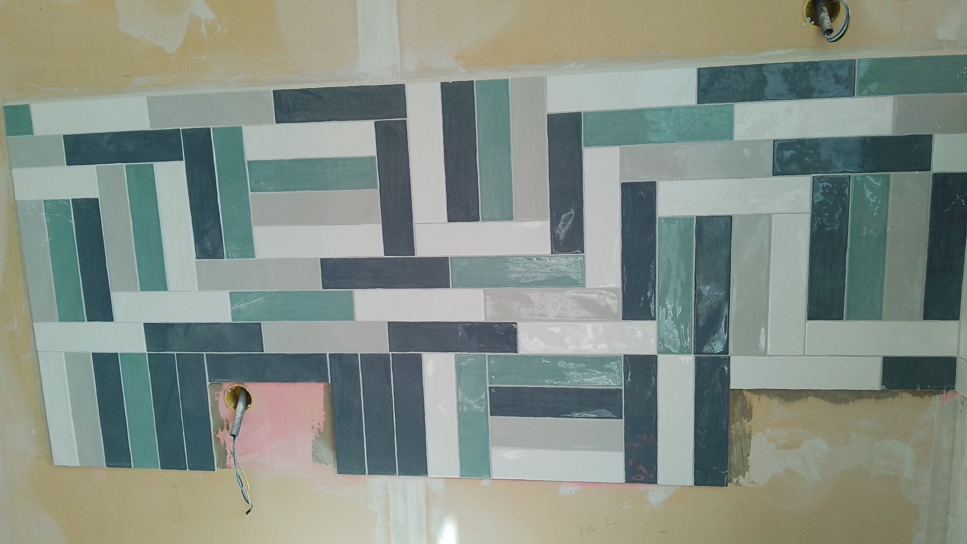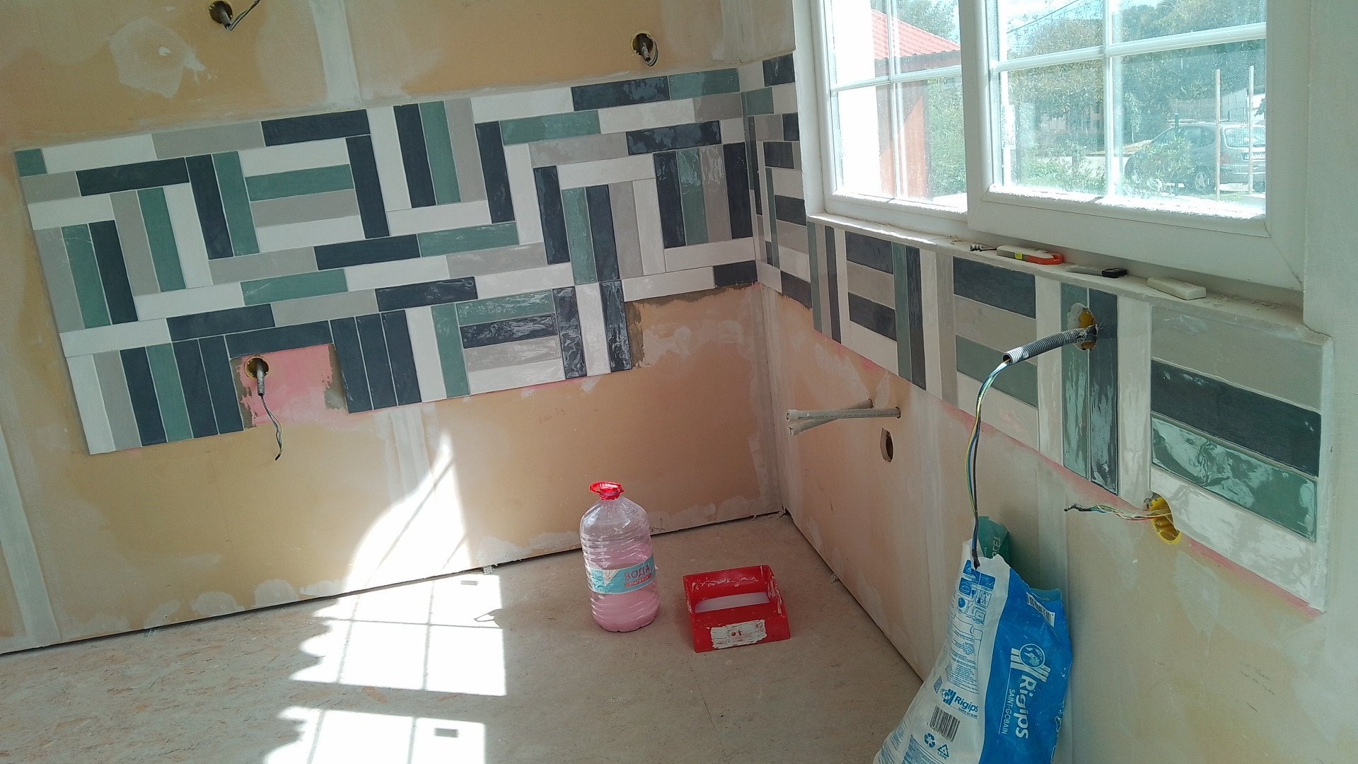 Тъй като няма с какво да се похваля, да си покажа плочките на кухнята /на морето/, които сама налепих. Имах задача с повишена трудност, тъй като мъжът ми не искаше да се режат и да се редят на рибя кост, както исках. Та, доста трудно ми беше - само 2-3 има нарязани. Стана като пано. Под прозореца нямаше друг вариант. А там, където се повтаря цветът, ще има печка и няма да се виждат вътрешните.