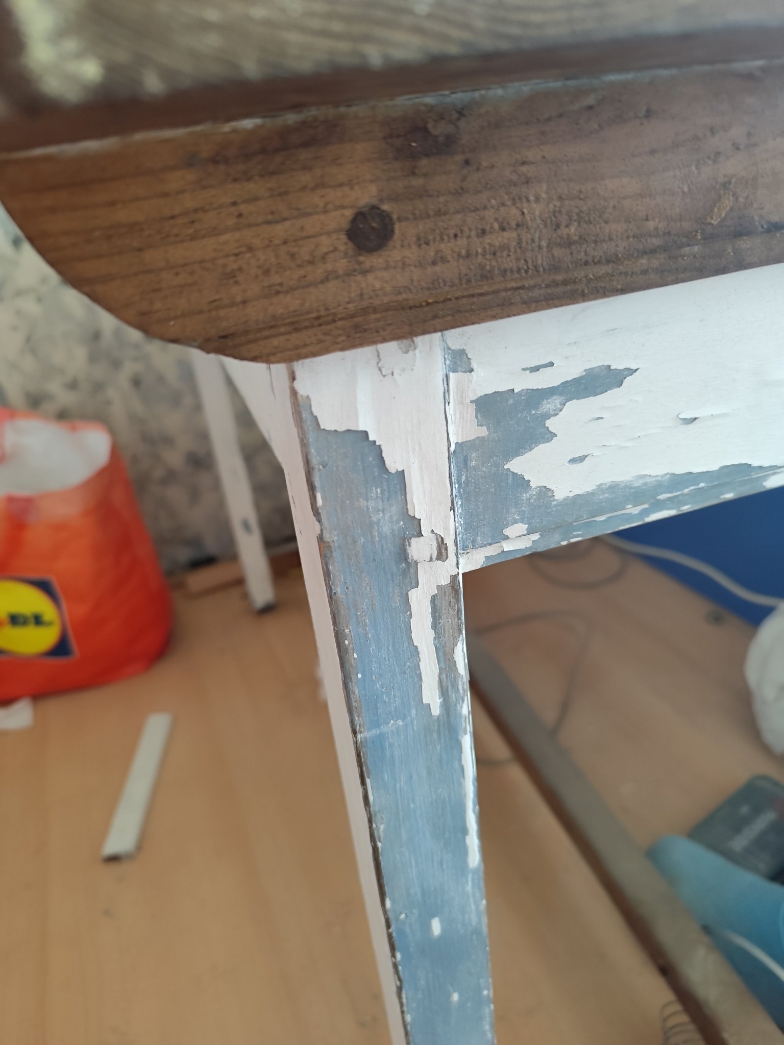 Това е резултатът от тебеширена боя и лак отпреди 2-3 години, като масата не е ползвана много и зашкурена преди боята: