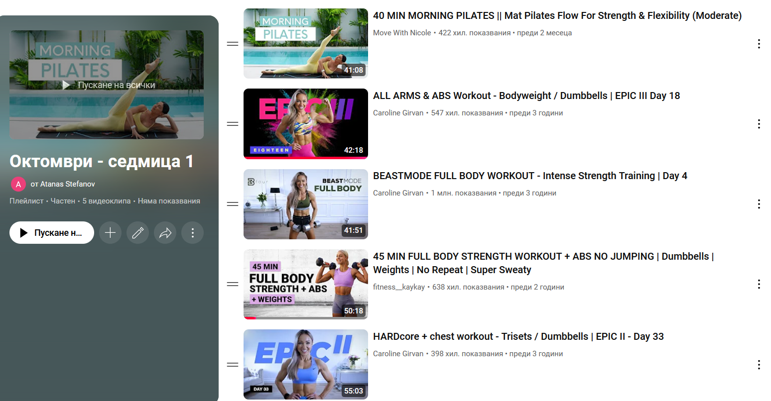 Набързо си направих една плейлист с 5 тренировки за седмица едно.