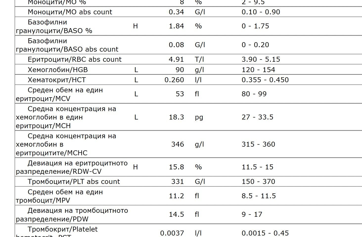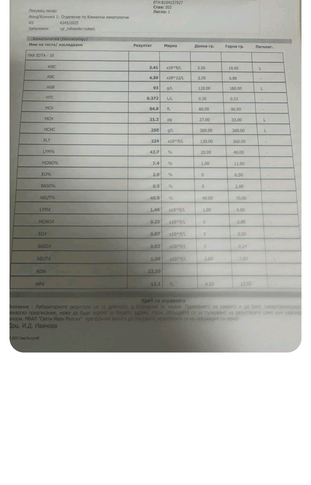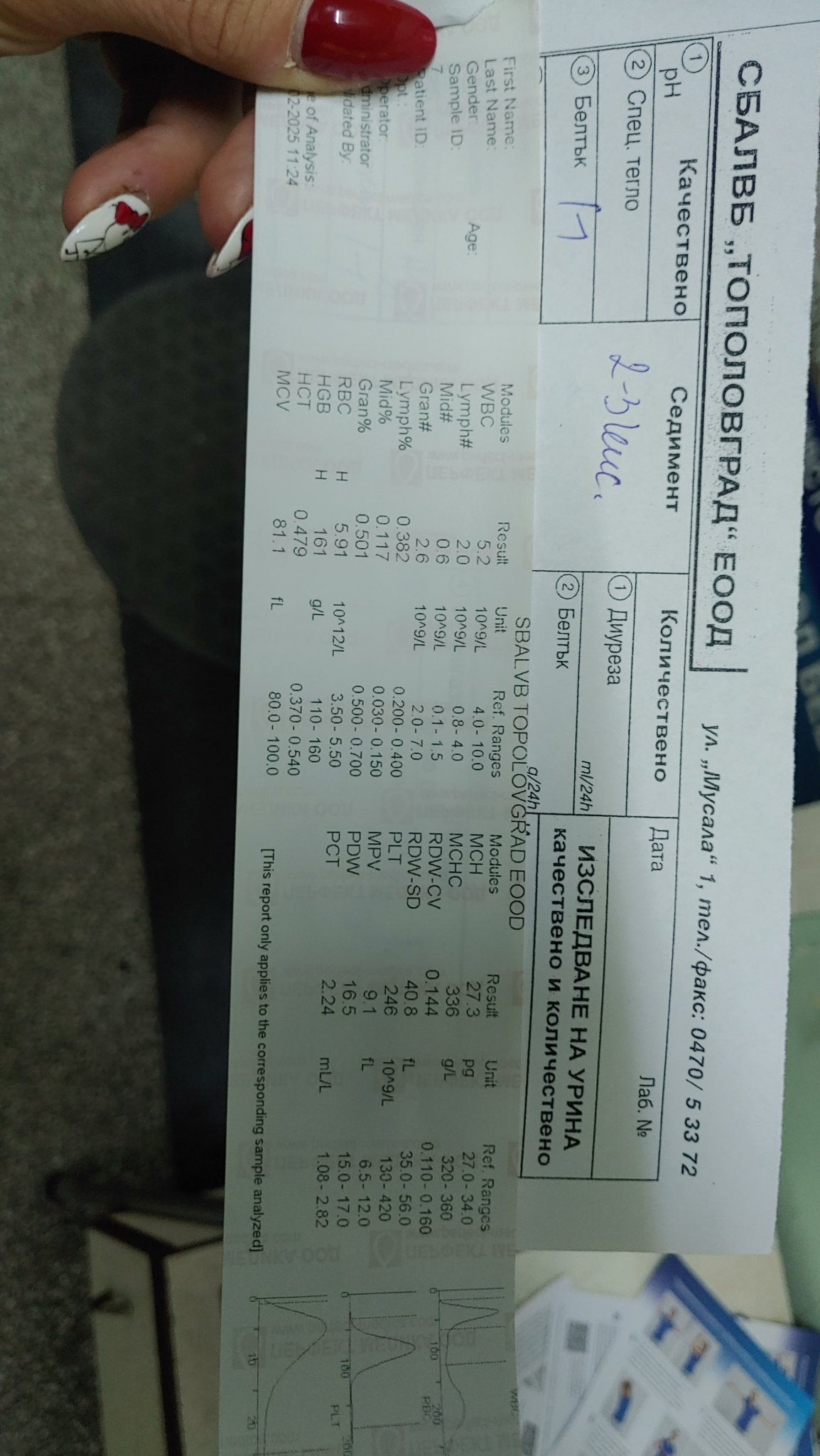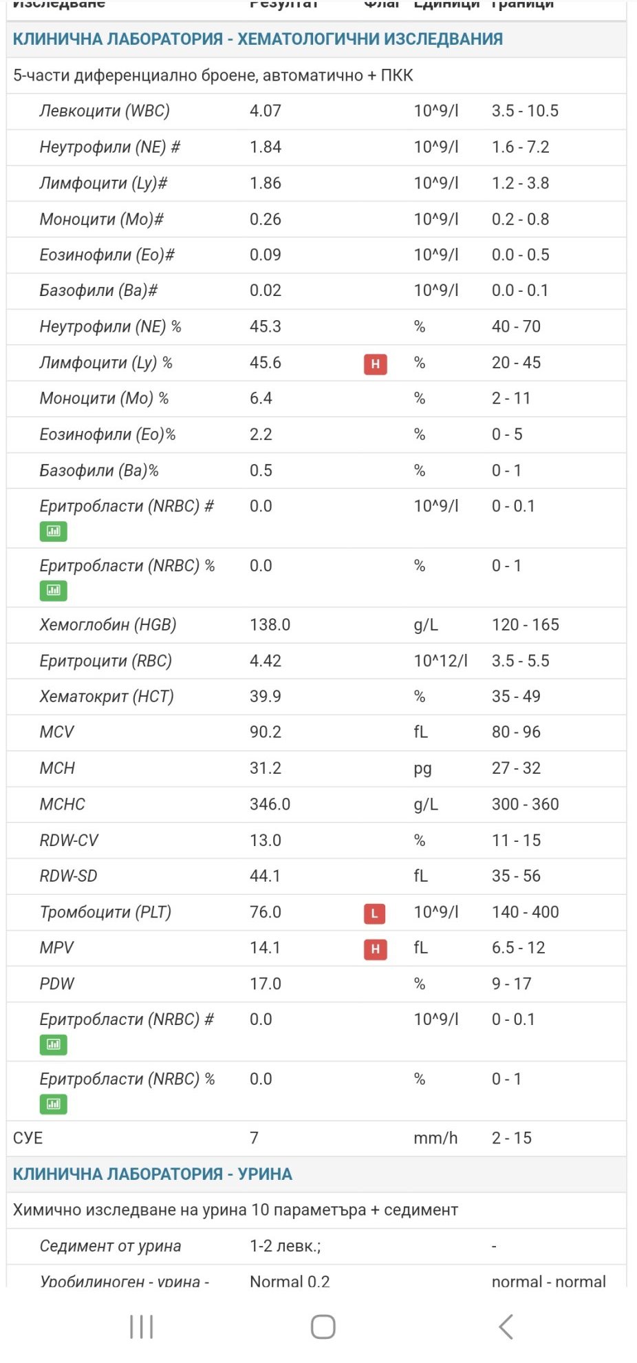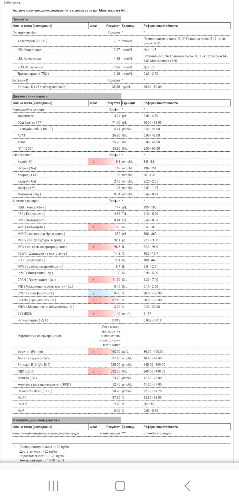 От кръвната картина, има завишени еритроцити, но незначително завишение на хемоглобин при 160 горна граница резултатът е 161, но хематокритът е в референтни стойности.
