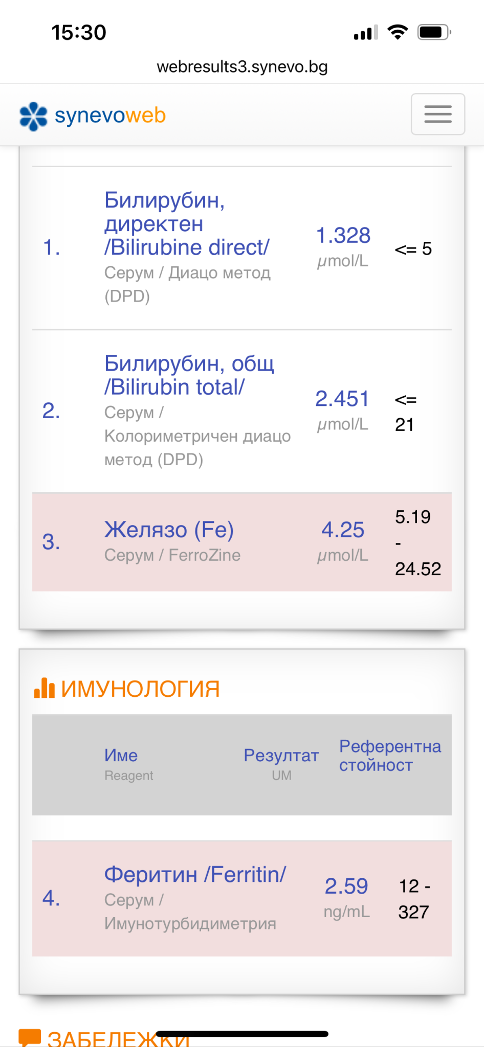 Към настоящия момент хемоглобинът е в референтни стойности, но поради по-ниските стойности на желязото моята препоръка към Вас е да не спирате Малтофера още поне 2 до 3 месеца. Трябва да насити депата с желязо, за да не се получава пак ефектът на падане на хемоглобина.