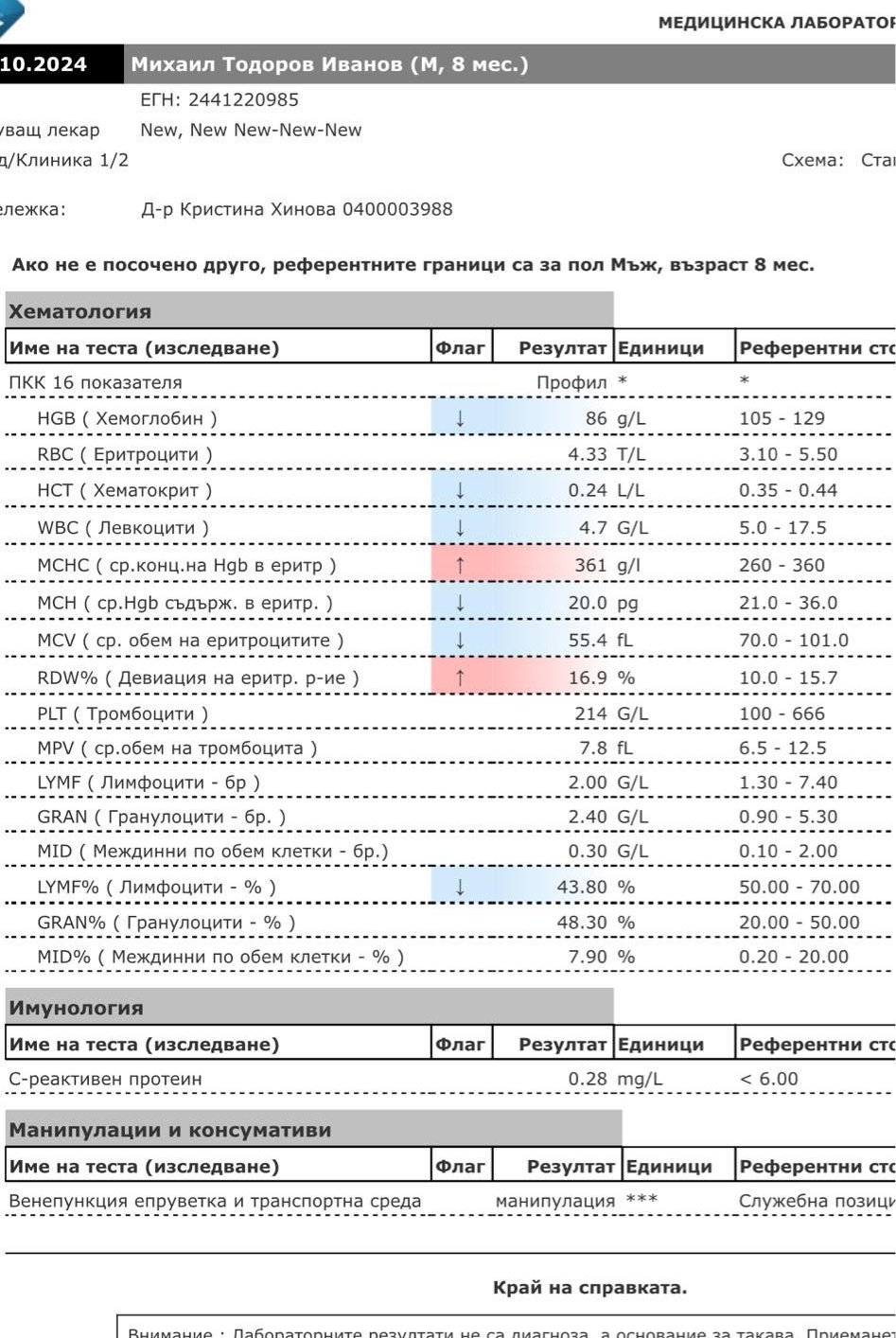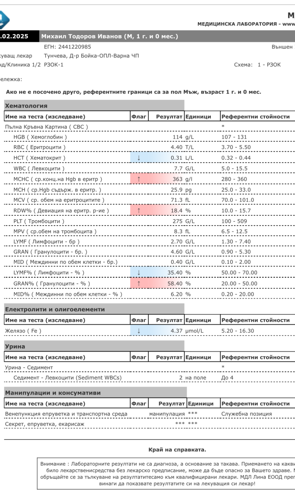 В заключение: Основните показатели са в референтни стойности и промяната на тези показатели е реактивна и динамична и се променя при различни обстоятелства. Хематологичен проблем в момента не се наблюдава. Най-вероятно при следващото изследване тези показатели ще са в референтни стойности.
