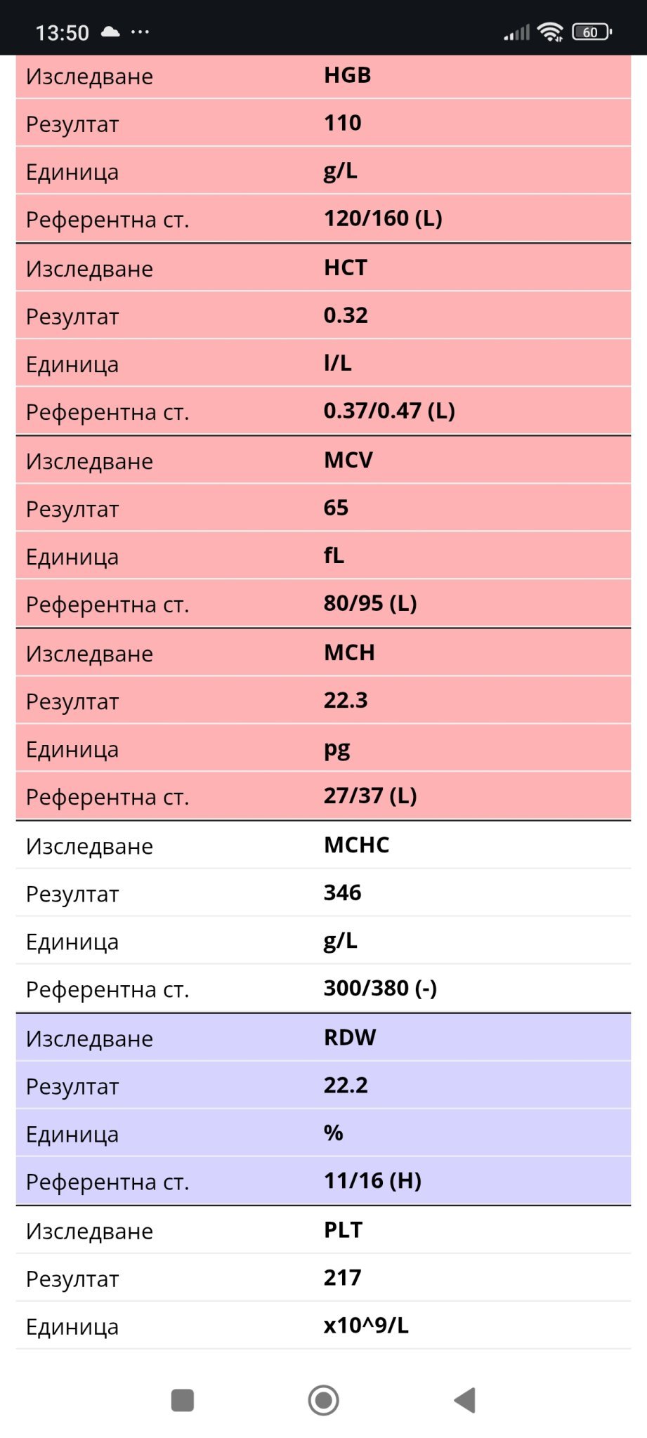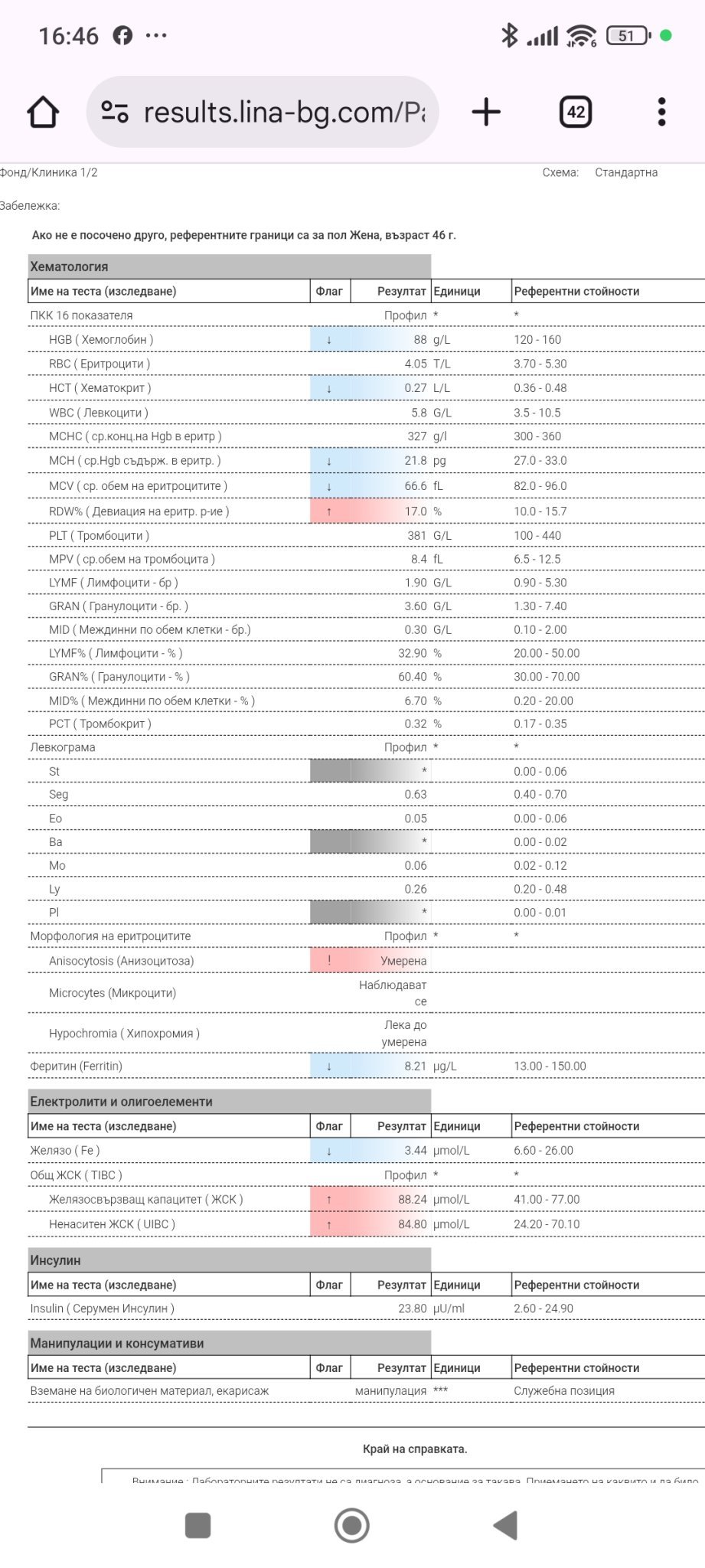 Бременна съм около 8 г.с. и понеже имам история на нисък хемоглобин реших да си пусна кръвни изследвания. След преглед при АГ ми изписа ЛИПОФЕРИЛАК ФОРТЕ капсули, но има съмнения, че съм с нещо по-сериозно от просто анемия. Освен това имам хематом и леко отлепяне, съответно кървя по малко от време на време. Какво мислите Вие според кръвните изследвания?