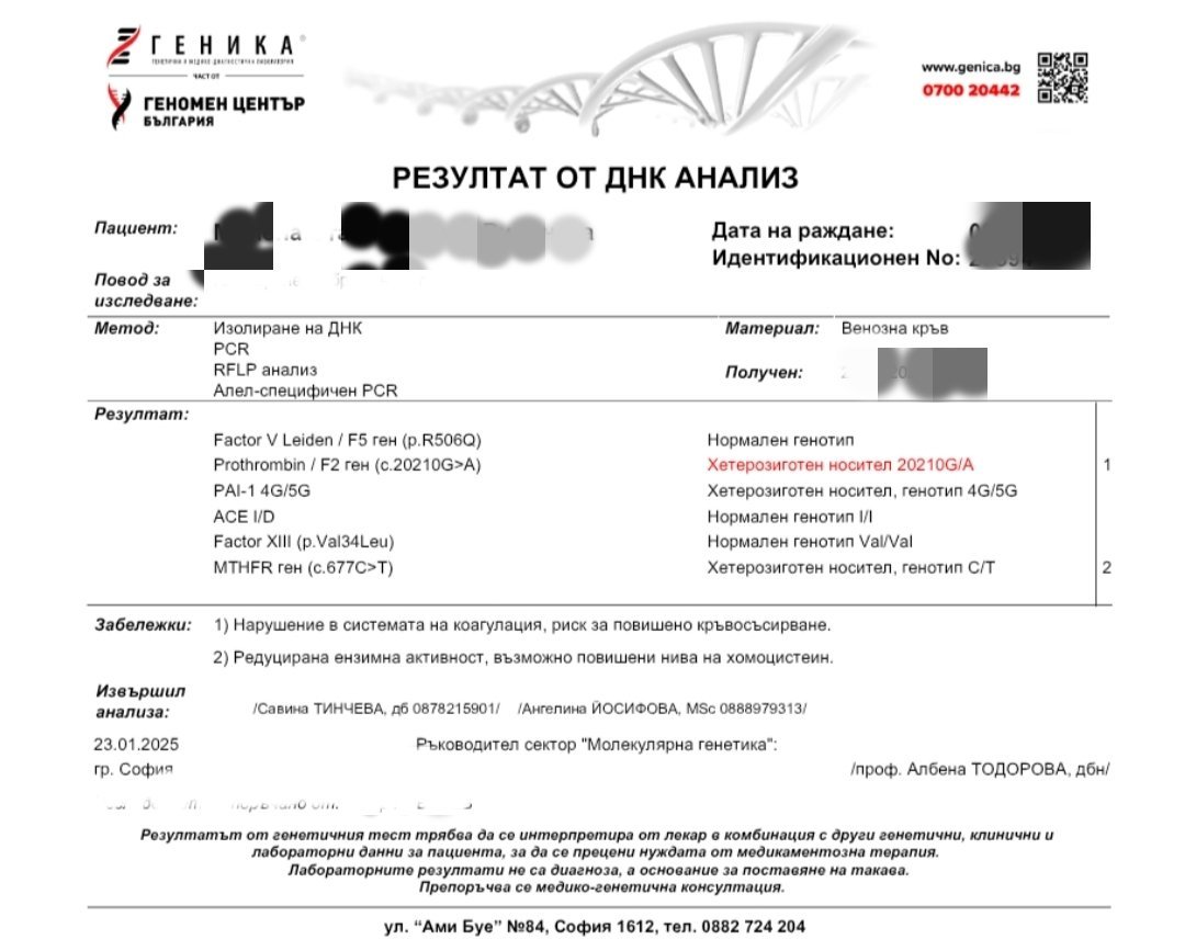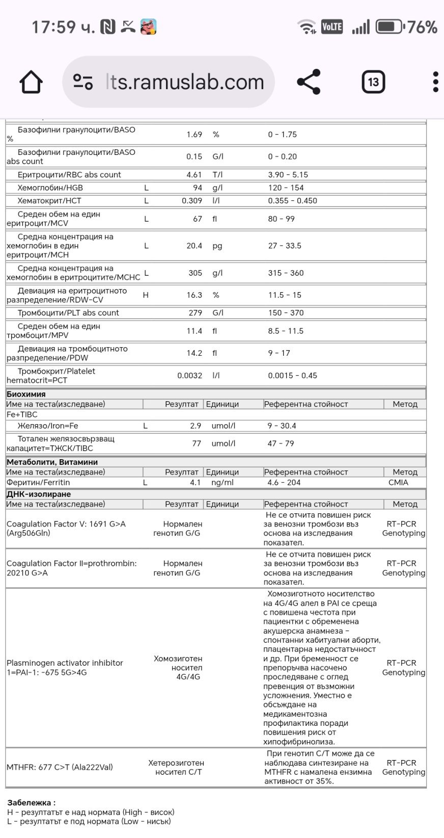 Здравейте, пуснах си профилактично изследвания за Тромбофилия. Имам две раждания в 36гс и 34гс и един аборт в 20гс(инфаркт на плацентата и изтекли води. Чак след аборта ме посъветваха да си пусна изследванията, а преди това всичко отдаваха на случайността. Анемията започна след аборта и до сега където съм ходила при хематолози, виждат ниското желязо и ми се изписва да го пия. Докато го пия хемоглобина ми се вдига, след като го спра пада и пак се връщам на изходна позиция. Въпросът ми е имали още изследвания, които трябва да пусна и как да действам с този хемоглобин и при евентуална бременност ще ми трябва ли някаква терапия?