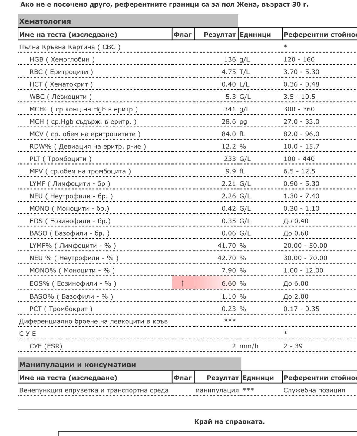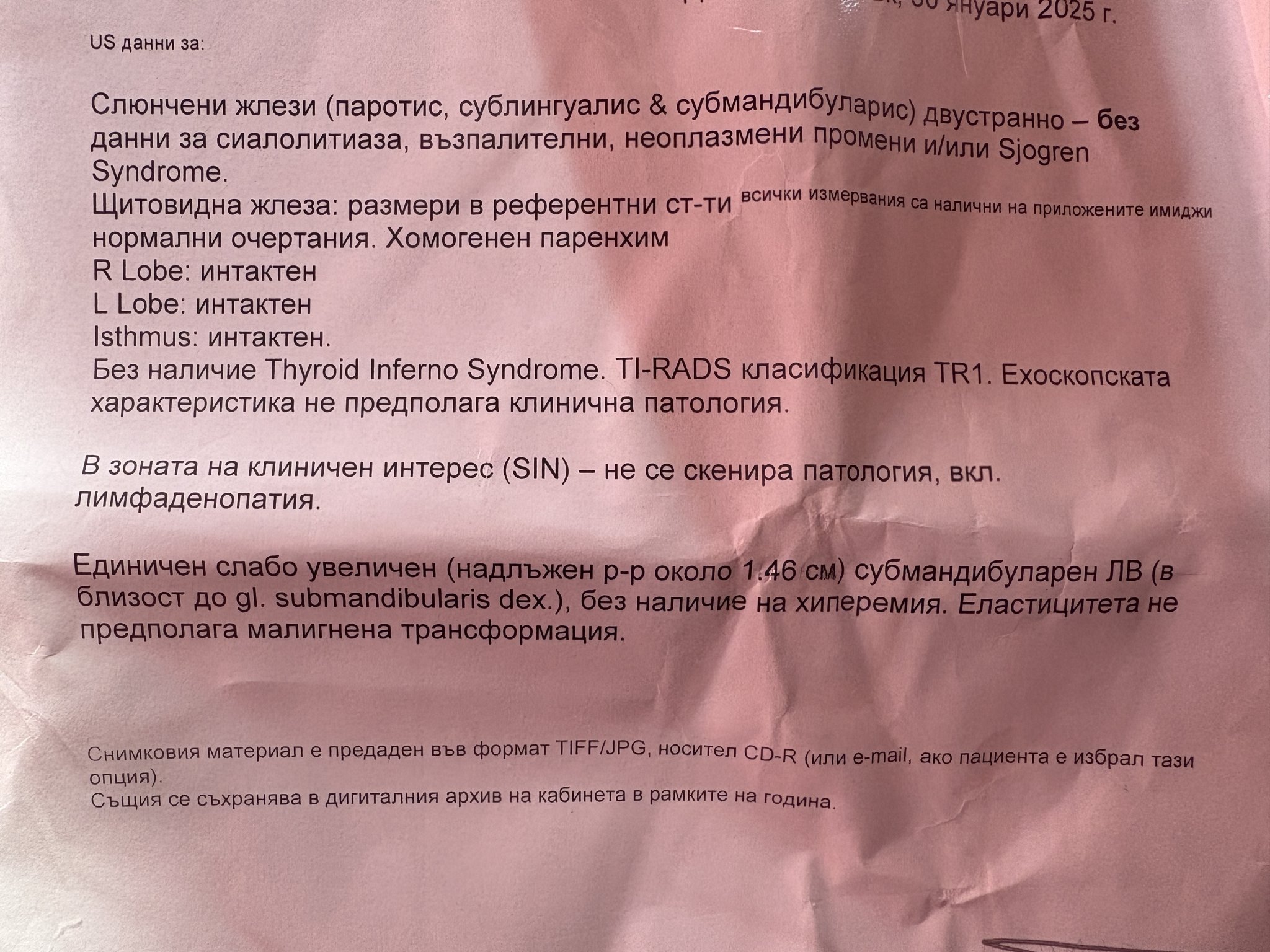 Здравейте! Тъй като се лутам преди да стигна до хематолог, Чак във вторник имам час,  реших да попитам и тук. През декември месец се чувствах отпаднала, замъглено зрение от време на време, мигрена, без грипоподобни симптоми. В началото на януари пуснах ПКК и излязоха леко завишени лимфоцити - горна граница 50.00, при мен 52.30. Всичко друго в норма. Съвсем леко завишени, но се притесних. Естествено прочетох кофти неща в интернет. Пуснах изследване за токсоплазмоза - отрицателен за минала и настояща инфекция. През това време се пробудих на няколко пъти от изпотяване вечер. Леко, без смяна на дрехи и чаршафи. Докато едната вечер не беше обилно, чаршафите бяха сухи, но се наложи да сменя и бельото си дори. На следващия ден Пуснах нова ПКК с Диференциално броене, този път само леко завишени еозинофили - горна граница 6.00, при мен 6.60. Преди това мина менструацията ми, която провокира херпес на устната /имам си го отдавна/, имах и обрив ситен по лицето без сърбеж. По принцип имам различни алергии също. Минах вчера и ехограф на лимфни възли - увеличен лимфен възел отдясно на шията под челюстта, отпред,1,46 см. Според докторът не е злокачествен. Реално от близо година усещам този лимфен възел, както и този от лявата страна на същото място. Не съм им обръщала внимание, досега. Дали от тревогата в момента или от нещо друго, усещам сухота в гърлото и понякога задух. Изключително съм притеснена. Благодаря Ви предварително за отговора!