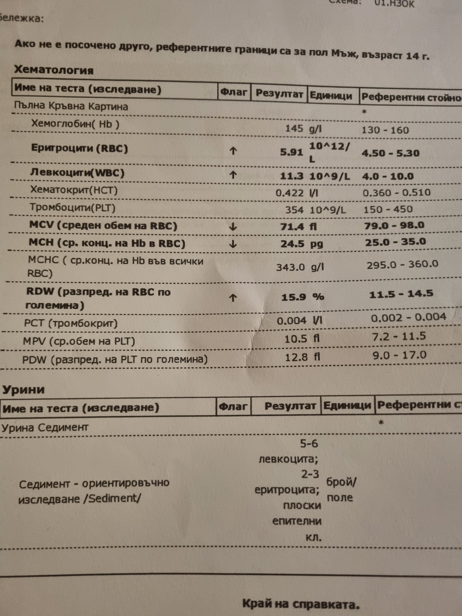 Здравейте, дали бихте погледнали отклоненията в кръвта картина на сина ми на 14 години, правена преди дни заради вирус. За втори път в рамките на половин година излизат такива показатели, педиатърът и пулмолог по повод другвирус преди месеци смятат че не са обезпокоителни и че трябва да приема храни богати на желязо като жълтък, червено месо и леща. Дали трябва на нещо да обърнем внимание? Благодаря !