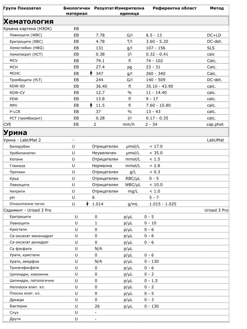 Относно показаните резултати от Ваша страна, наблюдава се констелация на инфекциозен процес, който е реактивен, т.е ще мине след известен период от време (това се отнася за левкоцитите), а относно еритроцити, както и индексите на еритроцитите, наблюдава се намаление на тези индекси.