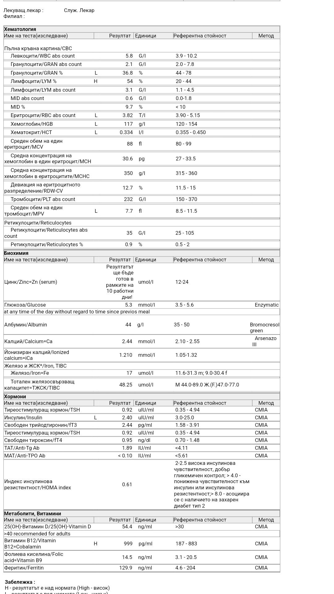 От останалите изследвания се наблюдават съвсем референтни стойности на железните депа (феритин), както и незначително увеличаване на серумното ниво на Вит Б12.