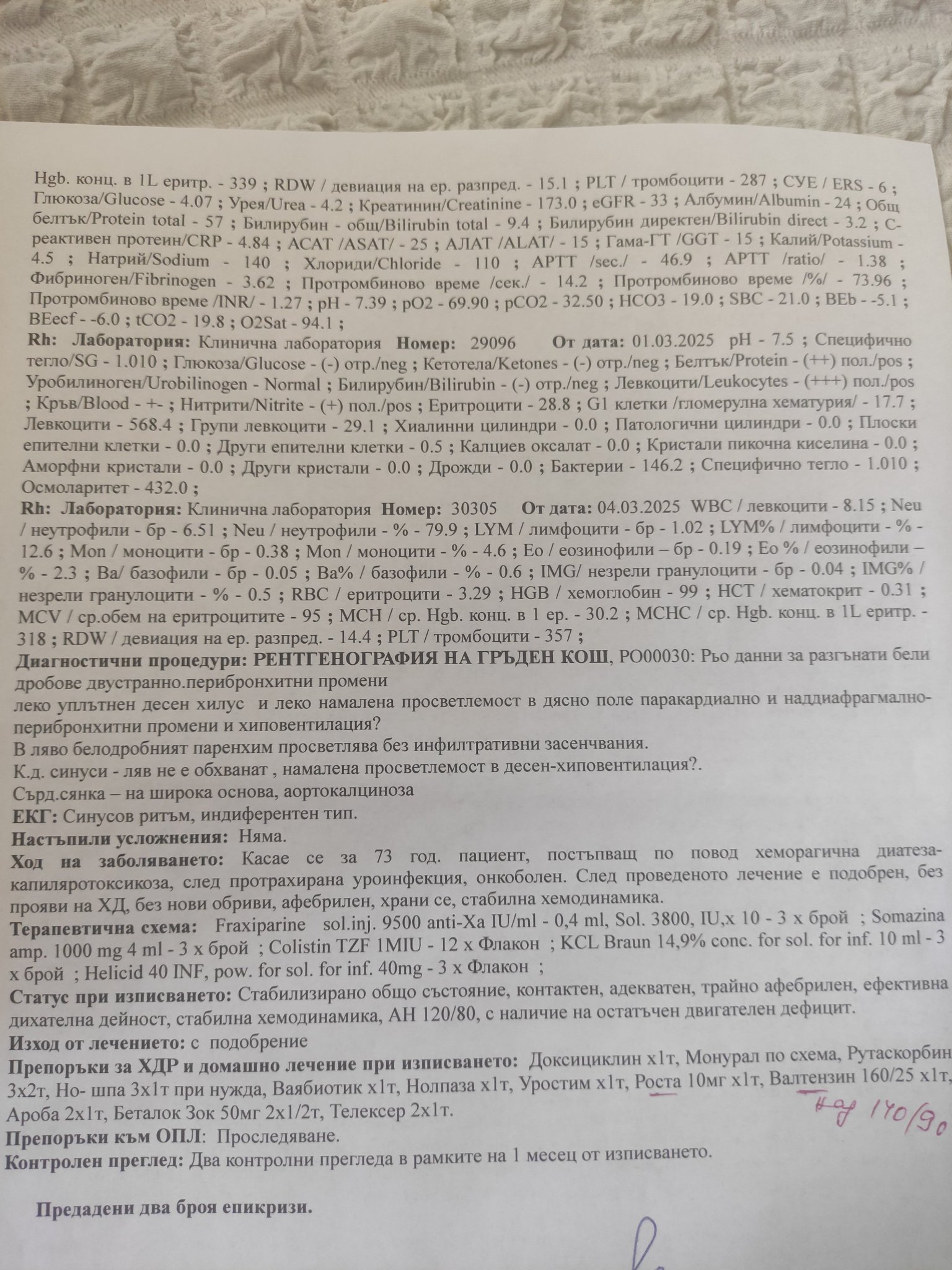 На база предоставената от Вас информация и показателите от кръвната картина към момента на хоспитализацията, баща Ви е с анемия (Хемоглобин 95 г/Л). Според мен този анемичен синдром се дължи на хроничен възпалително/инфекциозен процес.
