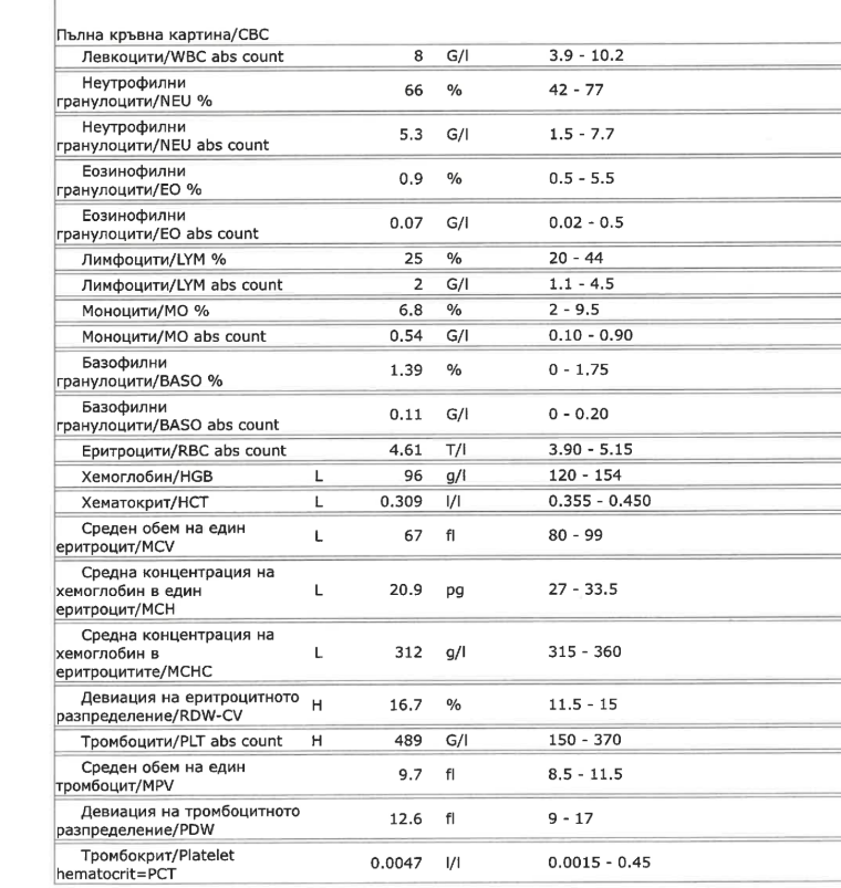 Хематокрит, MCV, MCH, MCHC - под долната граница , но близо до нея.