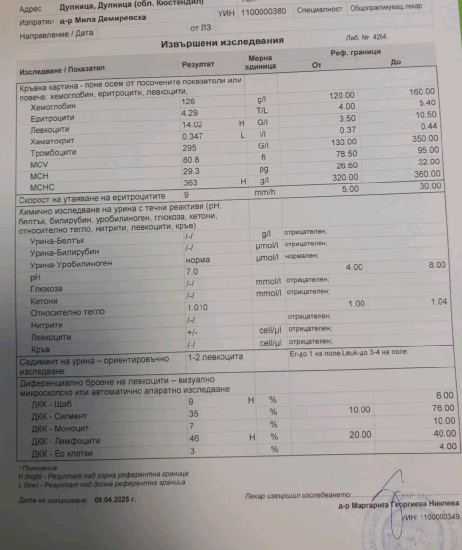 Препоръката ми е да проведете контролни изследвания след 1 месец, включващи ПКК, диференциално броене на левкоцити СУЕ, ЦРП, феритин, желязо, ЖСК.