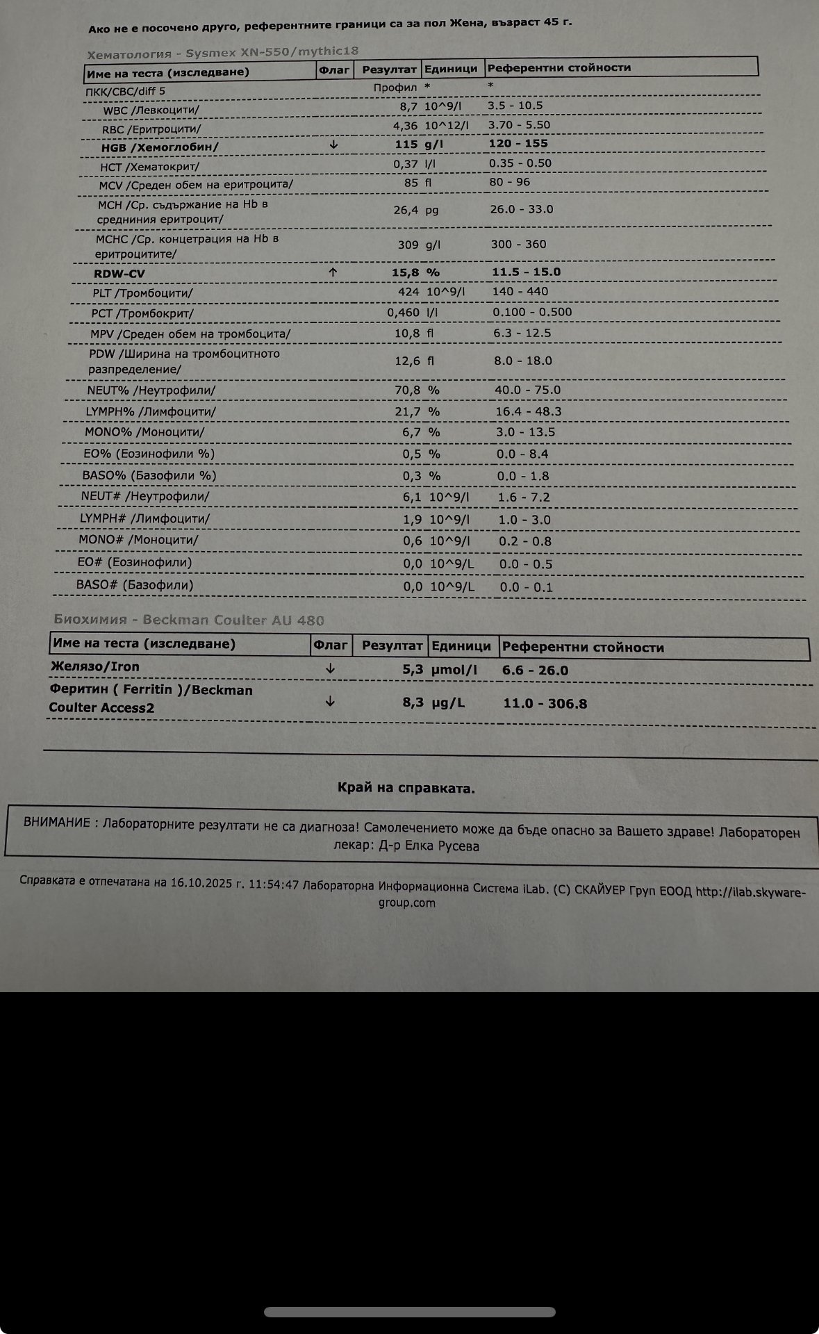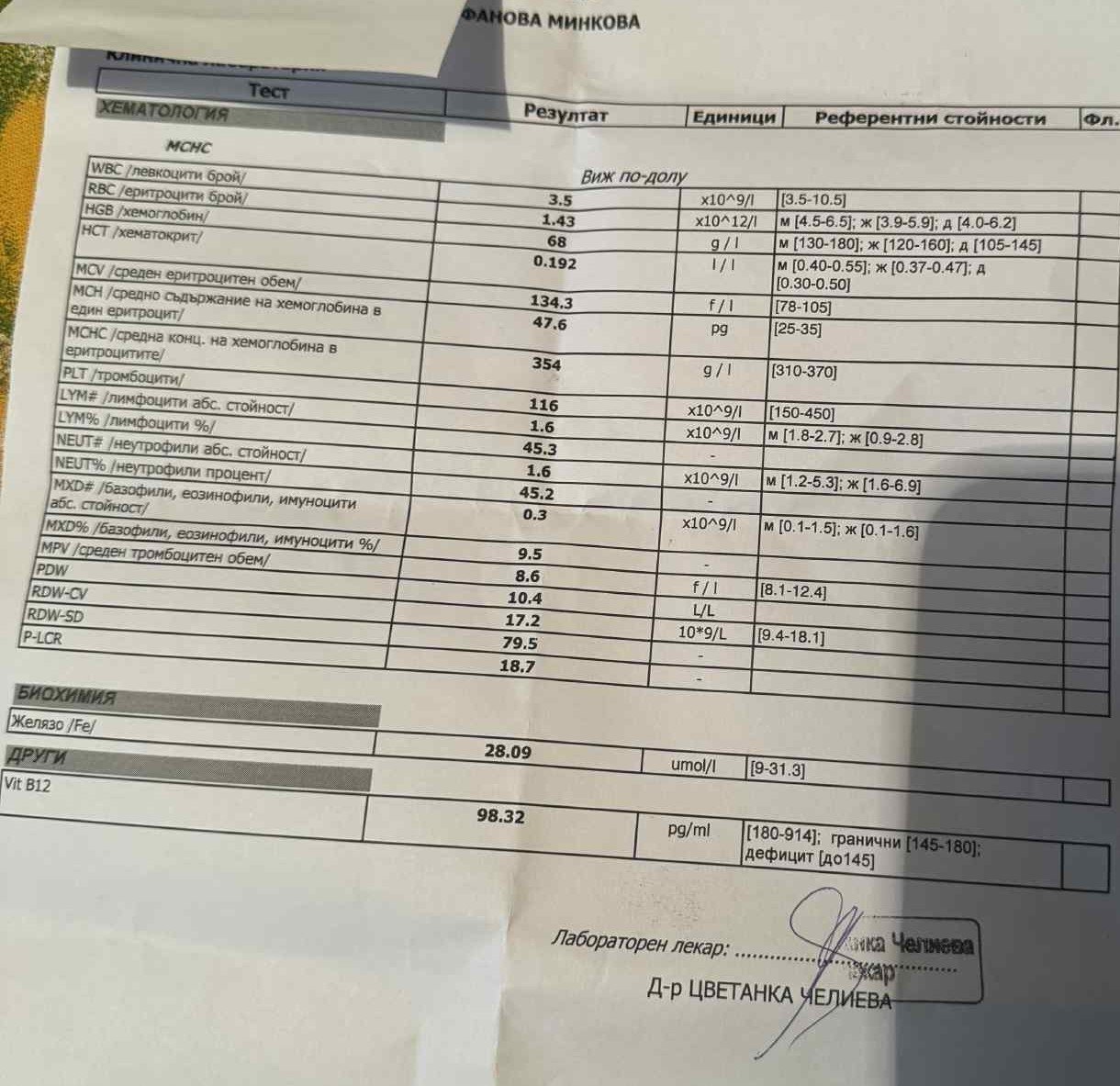 Прегледах изследванията Ви. Ще се наложи да имате прием на железен препарат за известен период от време и смятам, че по такъв начин ще се коригират както и изследванията, така и общото Ви състояние.
