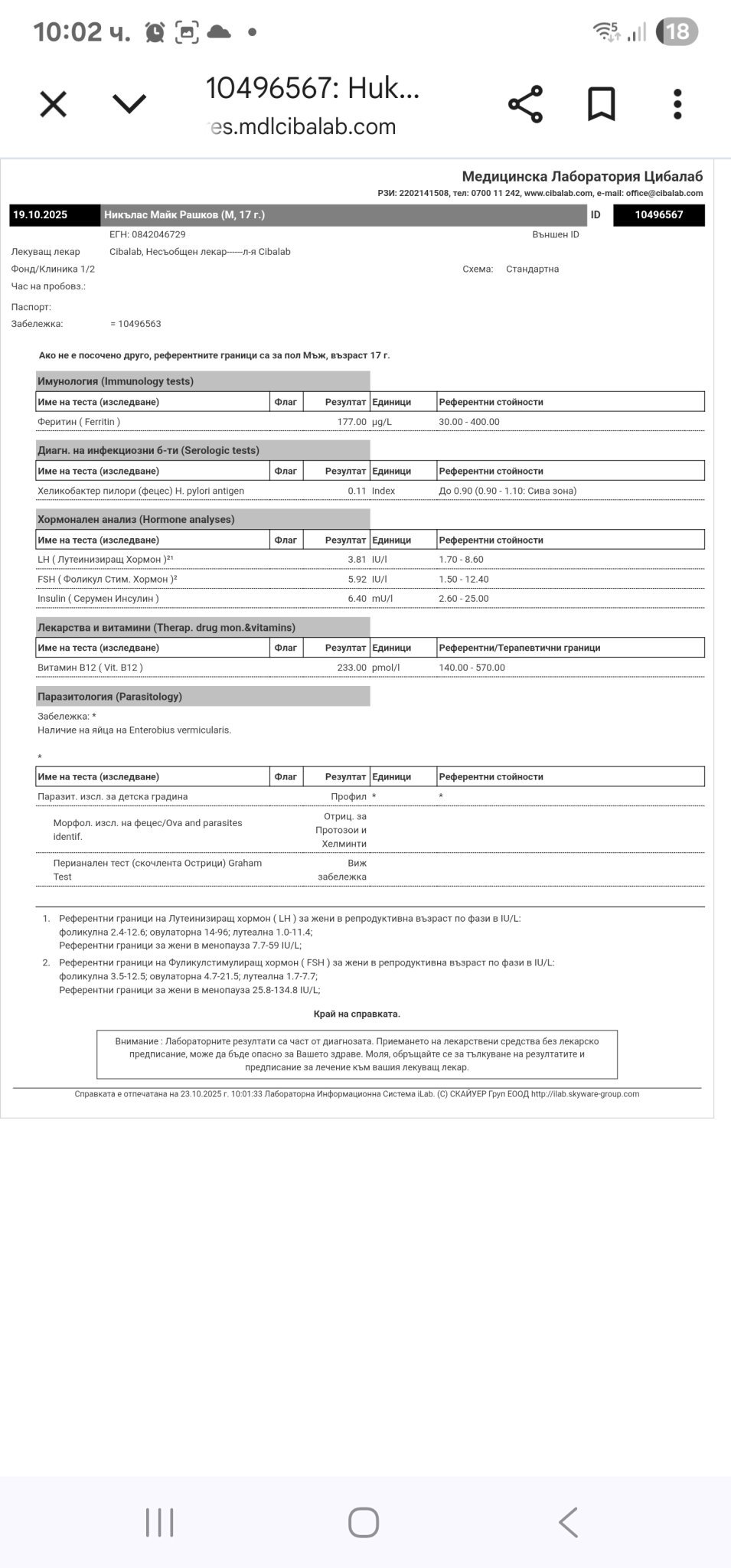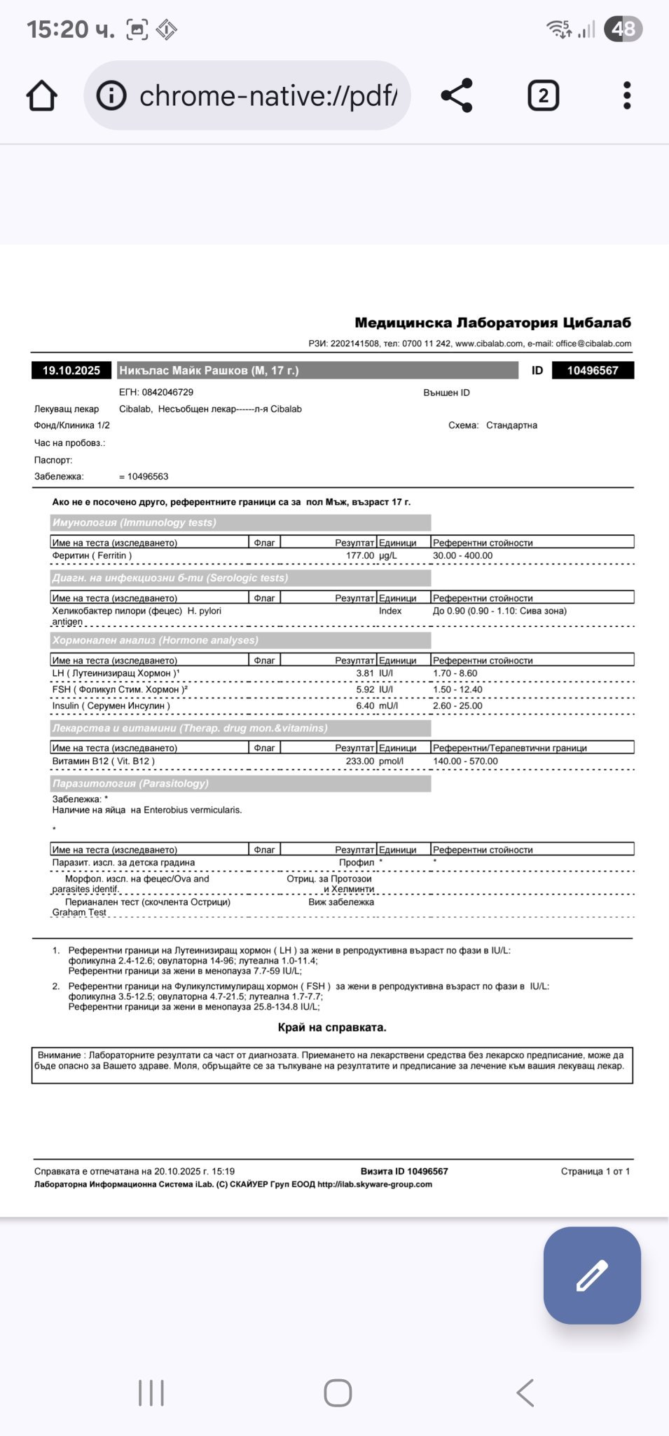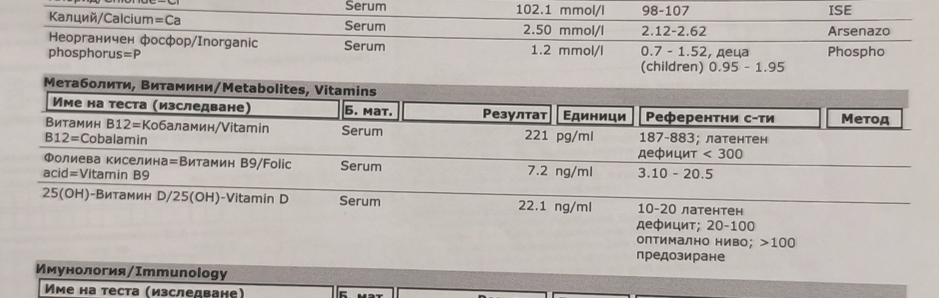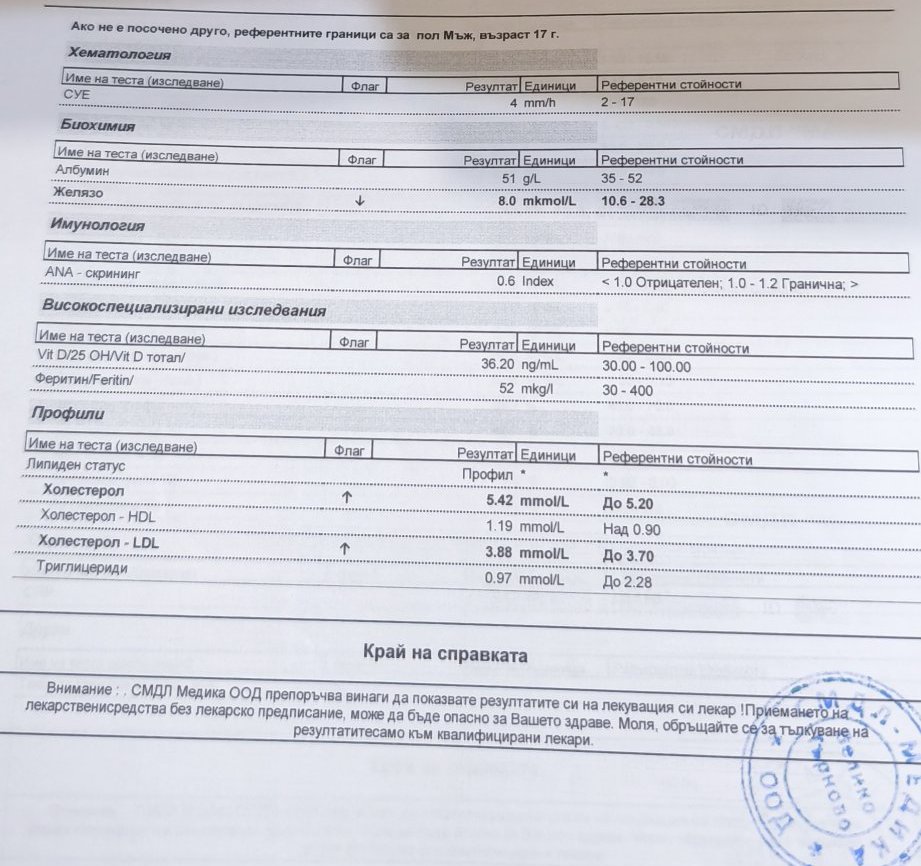Иначе, относно изследванията бих могъл да Ви назнача фолиева киселина да приема за 1 месец, а след това контролни изследвания на ПКК, ДКК, желязо, ЖСК, СУЕ, ЦРП, феритин, вит. Б12 и фолиева киселина.