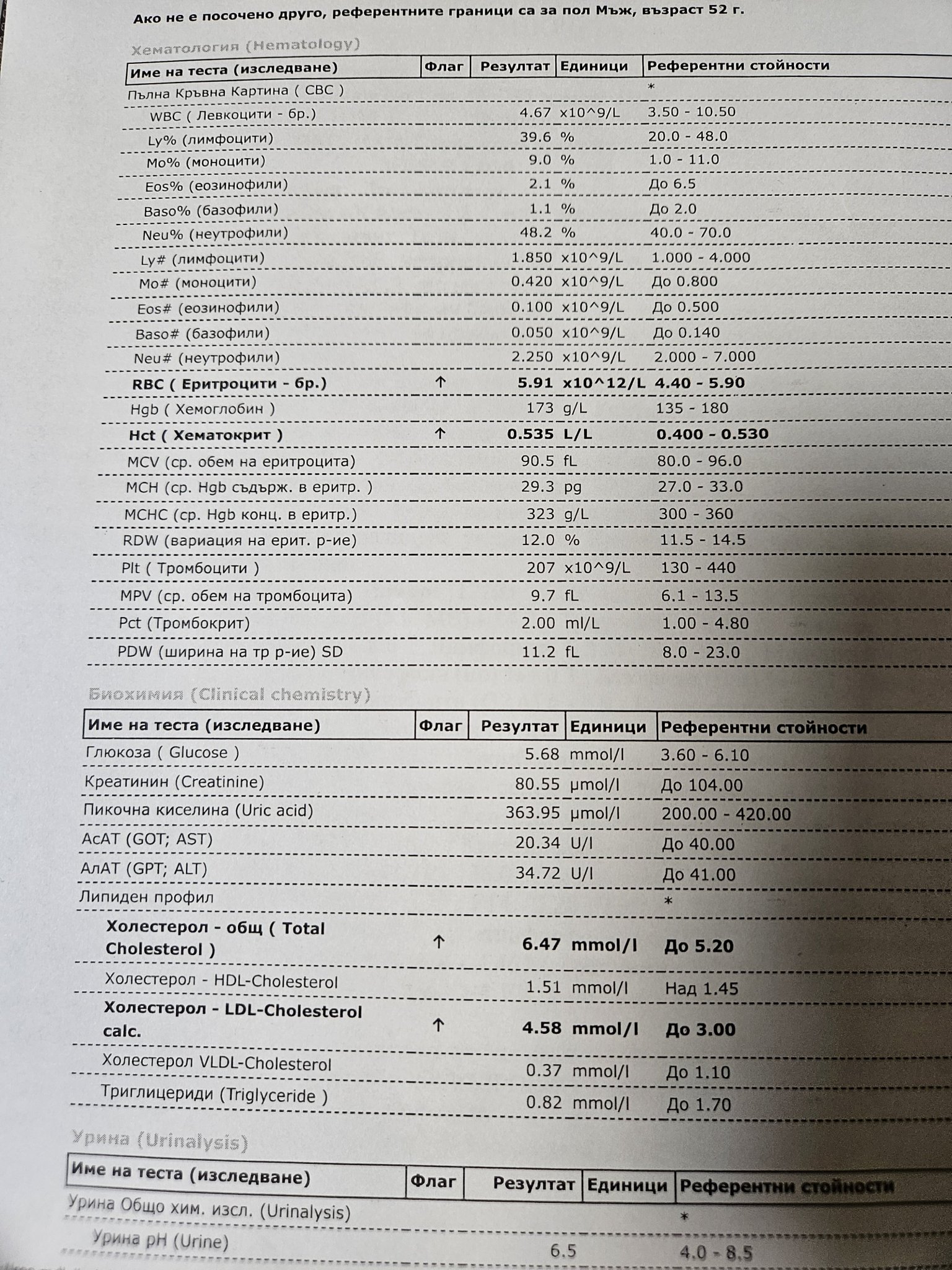 За пореден път има леко завишени стойности на хемоглобин и калций.Първото изследване беше през март 2025 и сега за втори път.