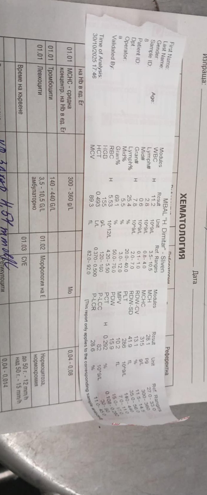 Препоръката ми е да проведете нови изследвания, които да включват ПКК, ДКК, СУЕ, ЦРП ЛДХ, и ако решите, мога да Ви консултирам и да проведем ехография на този възел след физикален преглед.