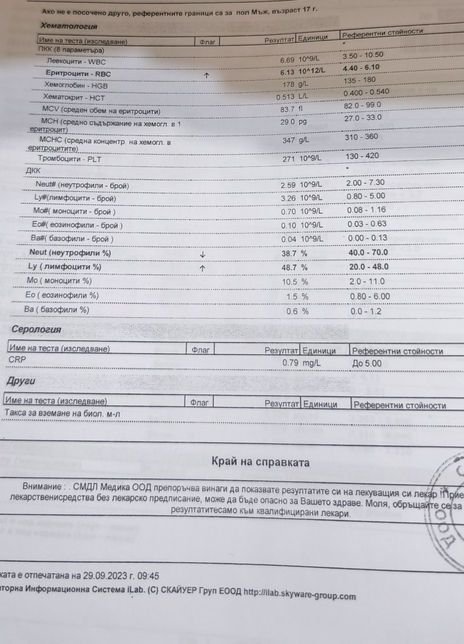 Прегледах изследванията. Показателите показват, че най вероятно се касае за незначителен възпалително-инфекциозен процес (завишени лековцити и отчасти неутрофили). А колкото до завишените стойности на еритроцитите, показателите по-скоро насочват на хемоконцентрация (по-ниска хидратация – нека да увеличи приема на вода).