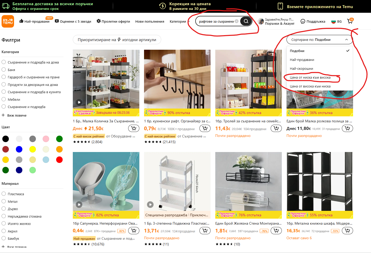 В приложението, доколкото помня, има такава възможност. Аз не съм го свалила. Иначе има вариант да сортираш стоките по цена – в горния десен ъгъл, където е "Sort by". Даваш да ги подреди от най-ниската към най-високата цена.