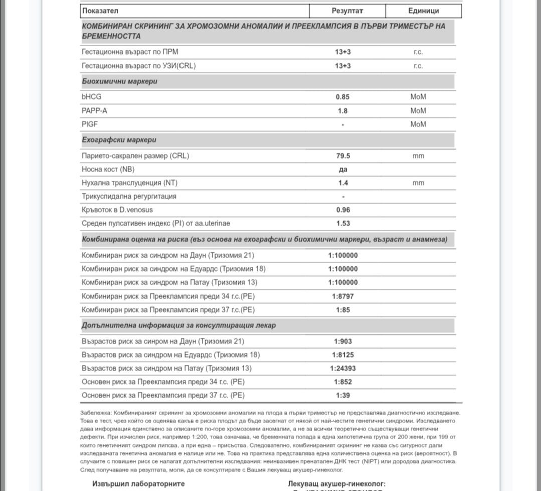 Здравейте! И аз бих искала да споделя резултатите си от БХС. Пускала съм 2пъти, но горе-долу по едно и също време. Вторият беше по препоръка за изчисление на риска от прееклампсия. Интересува ме именно прееклампсията и дали според вас рискът е висок, тъй като АГ ми предписа аспирин 150мг, а аз не съм сигурна кои точно резултати не са ми наред, за да излезе висок риск. Ще помоля ако някоя мама има нужните знания да сподели 💐