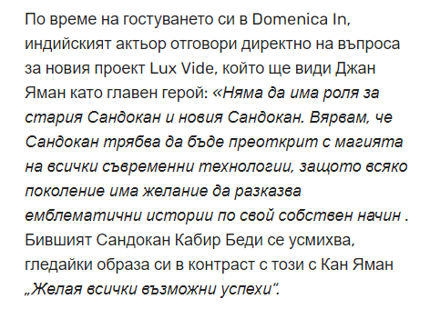 КБ: "Не, няма специална роля на стария Сандокан в новия Сандокан. Вярвам, че Сандокан трябва да бъде преоткрит с магията на всички нови технологии. Всяко поколение има желание да разказва емблематични истории по свой начин. Пожелавам всички възможни успехи"