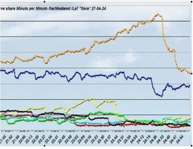 Кривата на вариетето "Най-добри години" на Rai1 се нарежда на второ място в диапазона от 15 до 20% за целия период. Движението #Amici (оранжева крива), което побеждава #IMiglioriAnni (синя крива) при затваряне от 37%."