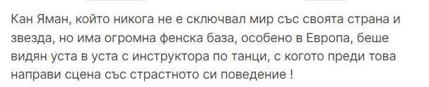 Фея, гледах всички клипове от въпросната вечер, явно моите очи гледат различно от твоите и от на турските жълтури. В тази шумна среда по какъв точно начин да разговарят, ако не се приближават/навеждат един към друг. Аз не видях целувка "уста в уста", както са писали турците, нито да му виси на врата и да му танцува в скута - тя просто си облегна ръката на него като му говореше..