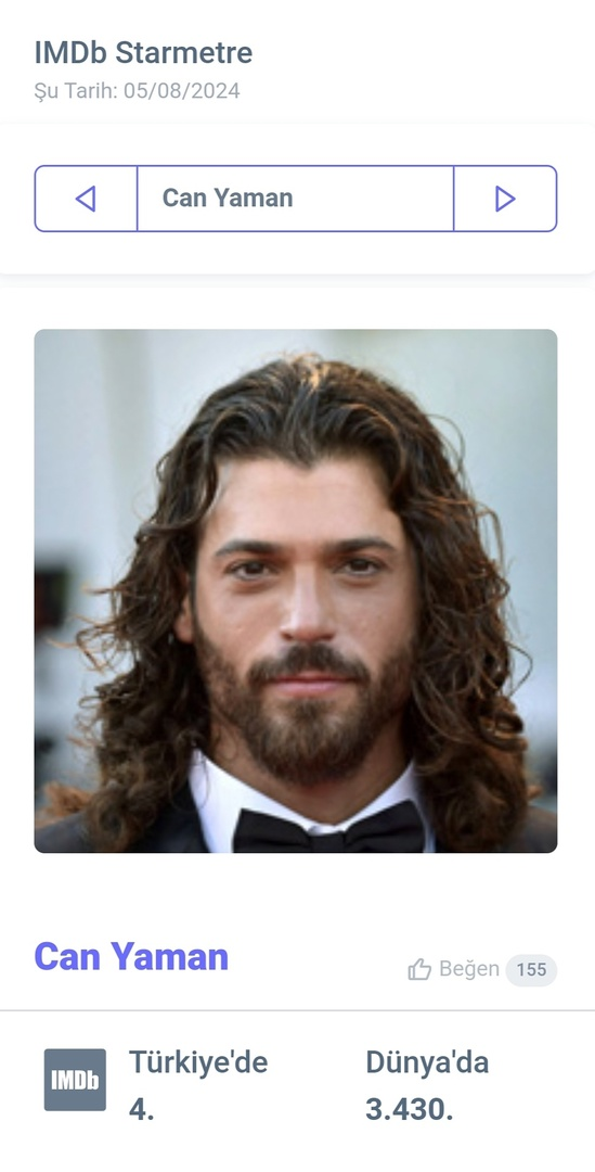 Джан Яман е класиран на 4-то място сред всички турски актьори и актриси в класацията на IMDb за седмицата, започваща от 05/08/24.Джан Яман е класиран на 3430 място от 11 милиона изпълнители, следвани по света.