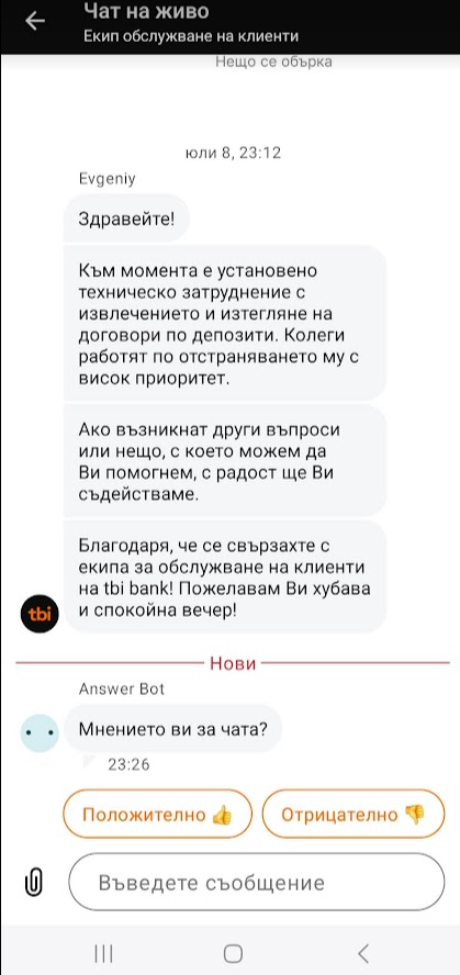 Да напиша нещо за "моя проблем", той е на всички явно де, но аз повдигнах тук въпроса, с липсата на депозитно извлечение и договор по депозит, който се изпраща на пощата. Писах на чата (не бях писал там от година). По мое мнение всъщност има подобрение. Преди пишех нещо, то ми дава че има още 30 маймуни на клона и тогава съм аз. И чакам и обновявам, да не си изпусна редът. Като ми дойдеше редът почвах да пиша отначало, не помнеше какво е писано. Сега е друго, поисках свързване със сътрудник, мислех че пак ще е същата процедура, но на инат им написах един ферман, приложих и скрин шотове, нямаше "опашка" от чакащи или поне нищо не ми написа. Бях и забравил че съм писал, гледам тая сутрин от TBI съобщение на телефона да оценявам чата, тъкмо се нервирам каква оценка за никакъв отговор, те отговорили хората, е вярно след 4-5 часа, но пак е нещо и си помни чата и какво сме писали, може да се продължи предполагам да се пише по същата тема. За мен е подобрение.